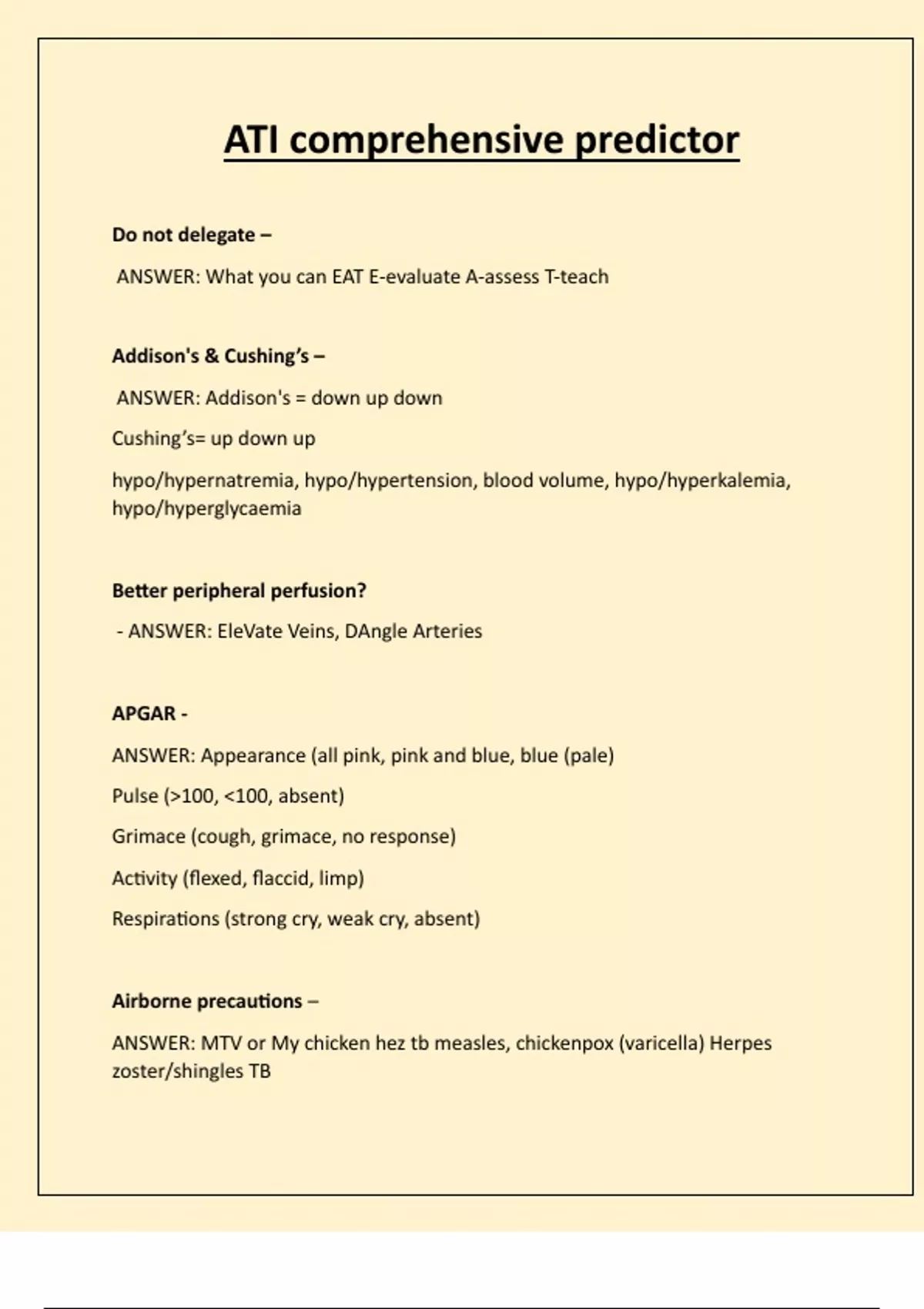 ATI comprehensive predictor Do not delegate – ANSWER: What you can EAT E-evaluate A-assess T-teach Addison's & Cushing’s – ANSWER: Addison's = down up down Cushing’s= up down up hypo/hypernatremia, hypo/hypertension, blood volume, hypo/hyperkalemia, hypo/hyperglycaemia Better peripheral perfusion? - ANSWER: EleVate Veins, DAngle Arteries APGAR - ANSWER: Appearance (all pink, pink and blue, blue (pale) Pulse (100, 100, absent) Grimace (cough, grimace, no response) Activity (flexed, flaccid, limp) Respirations (strong cry, weak cry, absent) Airborne precautions – ANSWER: MTV or My chicken hez tb measles, chickenpox (varicella) Herpes zoster/shingle
