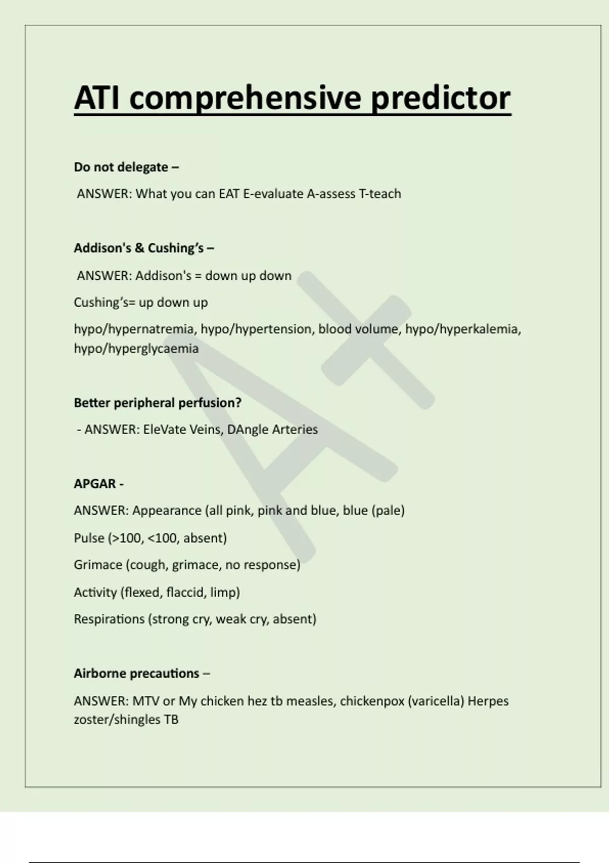 ATI comprehensive predictor Do not delegate – ANSWER: What you can EAT E-evaluate A-assess T-teach Addison's & Cushing’s – ANSWER: Addison's = down up down Cushing’s= up down up hypo/hypernatremia, hypo/hypertension, blood volume, hypo/hyperkalemia, hypo/hyperglycaemia Better peripheral perfusion? - ANSWER: EleVate Veins, DAngle Arteries APGAR - ANSWER: Appearance (all pink, pink and blue, blue (pale) Pulse (100, 100, absent) Grimace (cough, grimace, no response) Activity (flexed, flaccid, limp) Respirations (strong cry, weak cry, absent) Airborne precautions – ANSWER: MTV or My chicken hez tb measles, chickenpox (varicella) Herpes zoster/shingle