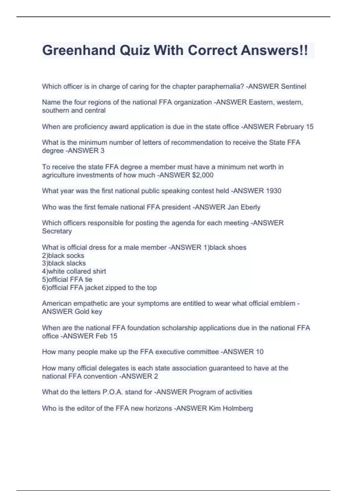 Greenhand Quiz With Correct Answers!!