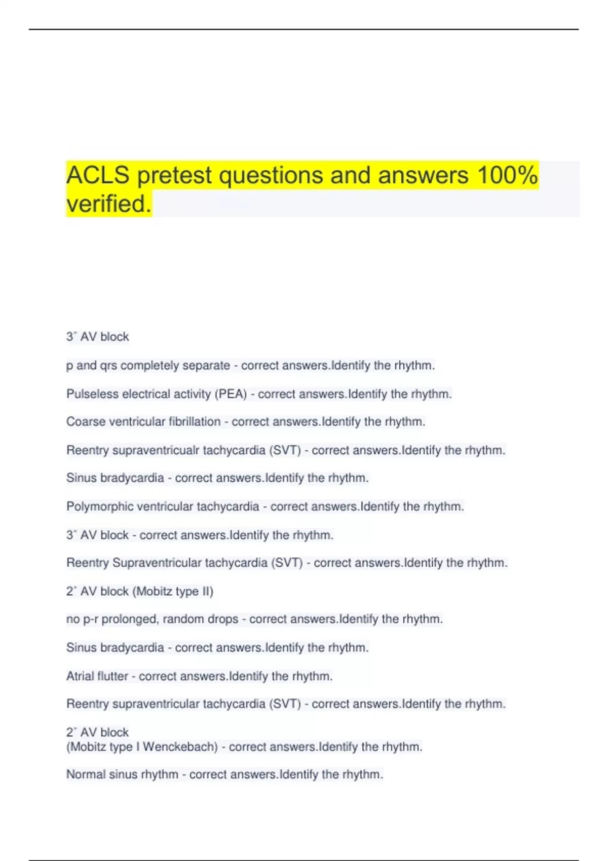 ACLS pretest questions and answers 100% verified. 3˚ AV block p and qrs completely separate - correct answers.Identify the rhythm. Pulseless electrical activity (PEA) - correct answers.Identify the rhythm. Coarse ventricular fibrillation - correct answers.Identify the rhythm. Reentry supraventricualr tachycardia (SVT) - correct answers.Identify the rhythm. Sinus bradycardia - correct answers.Identify the rhythm. Polymorphic ventricular tachycardia - correct answers.Identify the rhythm. 3˚ AV block - correct answers.Identify the rhythm. Reentry Supraventricular tachycardia (SVT) - correct answers.Identify the rhythm. 2˚ AV block (Mobitz type II) no p-r prolonged, random drops - correct answers.Identify the rhythm. Sinus bradycardia - correct answers.Identify the rhythm. Atrial flutter - correct answers.Identify the rhythm. Reentry supraventricular tachycardia (SVT) - correct answers.Identify the rhythm. 2˚ AV block (Mobitz type I Wenckebach) - correct answers.Identify the rhythm. Normal sinus rhythm - correct answers.Identify the rhythm.