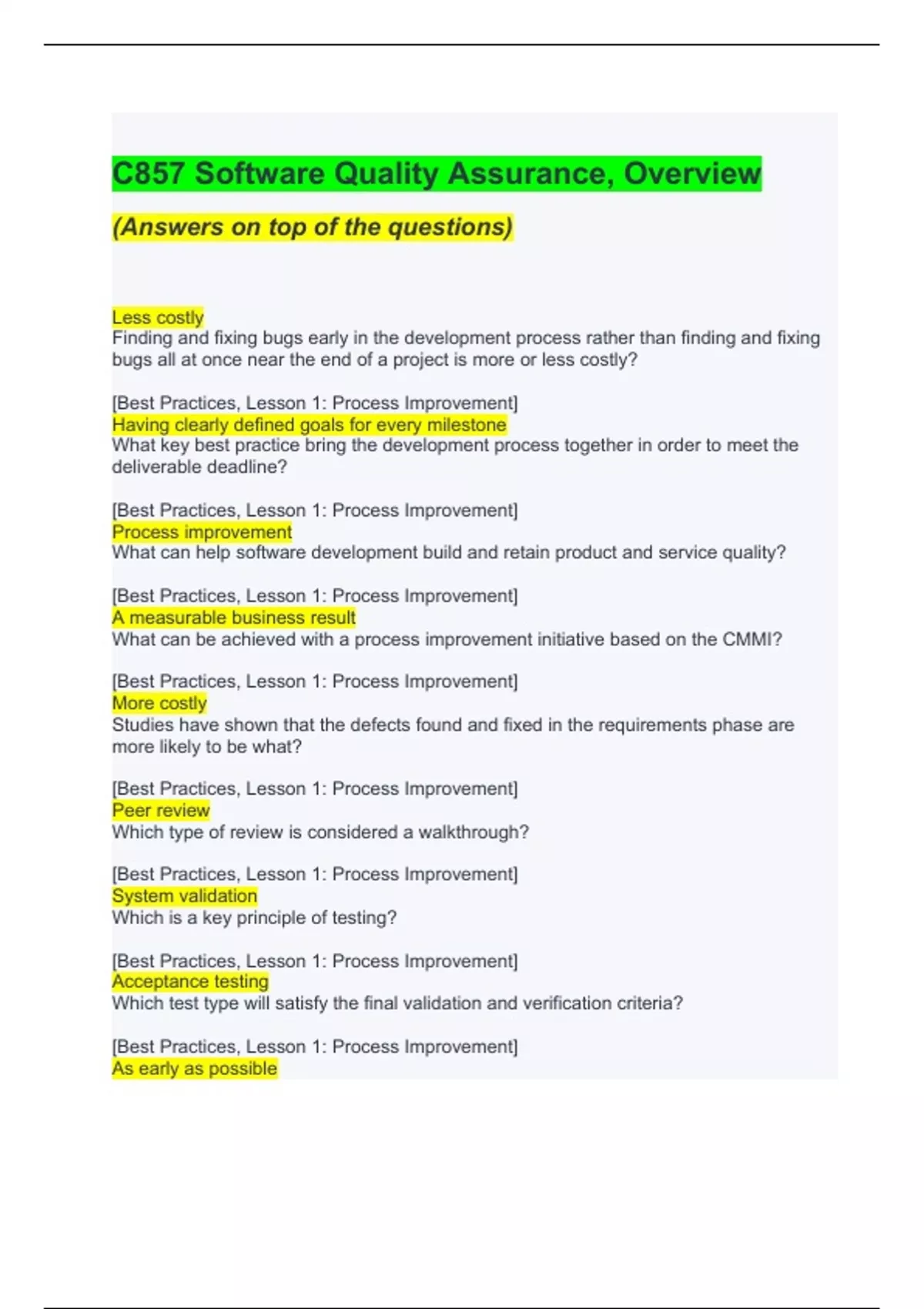 C857 Software Quality Assurance, Overview (Answers on top of the questions) Less costly Finding and fixing bugs early in the development process rather than finding and fixing bugs all at once near the end of a project is more or less costly? [Best Practices, Lesson 1: Process Improvement] Having clearly defined goals for every milestone What key best practice bring the development process together in order to meet the deliverable deadline? [Best Practices, Lesson 1: Process Improvement] Process improvement What can help software development build and retain product and service quality? [Best Practices, Lesson 1: Process Improvement] A measurable business result What can be achieved with a process improvement initiative based on the CMMI? [Best Practices, Lesson 1: Process Improvement] More costly Studies have shown that the defects found and fixed in the requirements phase are more likely to be what? [Best Practices, Lesson 1: Process Improvement] Peer review Which type of review is considered a walkthrough? [Best Practices, Lesson 1: Process Improvement] System validation Which is a key principle of testing? [Best Practices, Lesson 1: Process Improvement] Acceptance testing Which test type will satisfy the final validation and verification criteria? [Best Practices, Lesson 1: Process Improvement] As early as possible When is the appropriate time to include people responsible for quality in the development cycle? [Best Practices, Lesson 1: Process Improvement] Giving the team the opportunity to voice their concerns and advocate for their own priorities What is the benefit of building a discrete list of defects and ranking them in order of importance? [Best Practices, Lesson 2: Bug Management] A matrix of impacts versus severity What is a visual definition of how you will prioritize bugs as they are discovered? [Best Practices, Lesson 2: Bug Management] A bug base What is a system for keeping track of every bug logged in a database system called? [Best Practices, Lesson 2: Bug Management] A test case management system What is the best way to document and keep track of test cases? [Best Practices, Lesson 2: Bug Manage