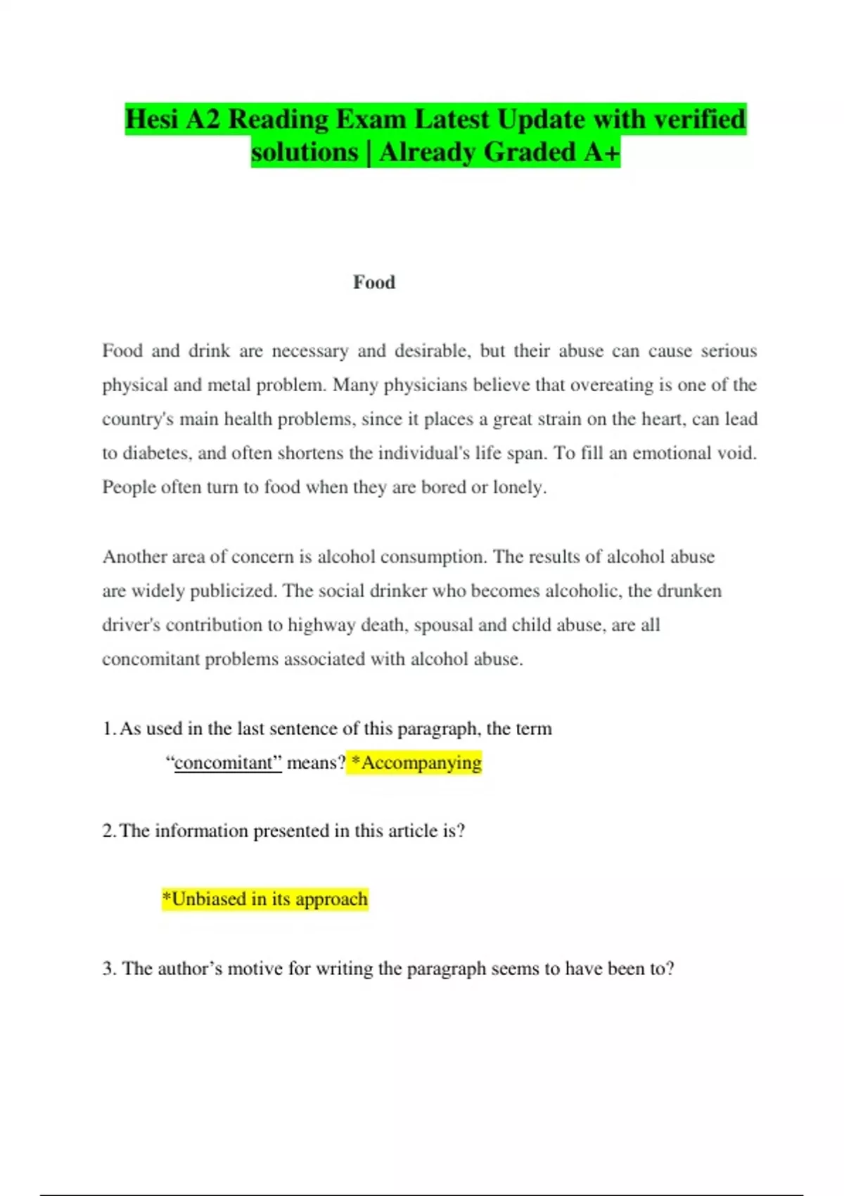 Food and drink are necessary and desirable, but their abuse can cause serious physical and metal problem. Many physicians believe that overeating is one of the country's main health problems, since it places a great strain on the heart, can lead to diabetes, and often shortens the individual's life span. To fill an emotional void. People often turn to food when they are bored or lonely. Another area of concern is alcohol consumption. The results of alcohol abuse are widely publicized. The social drinker who becomes alcoholic, the drunken driver's contribution to highway death, spousal and child abuse, are all concomitant problems associated with alcohol abuse. 1.As used in the last sentence of this paragraph, the term “concomitant” means? *Accompanying 2.The information presented in this article is? *Unbiased in its approach