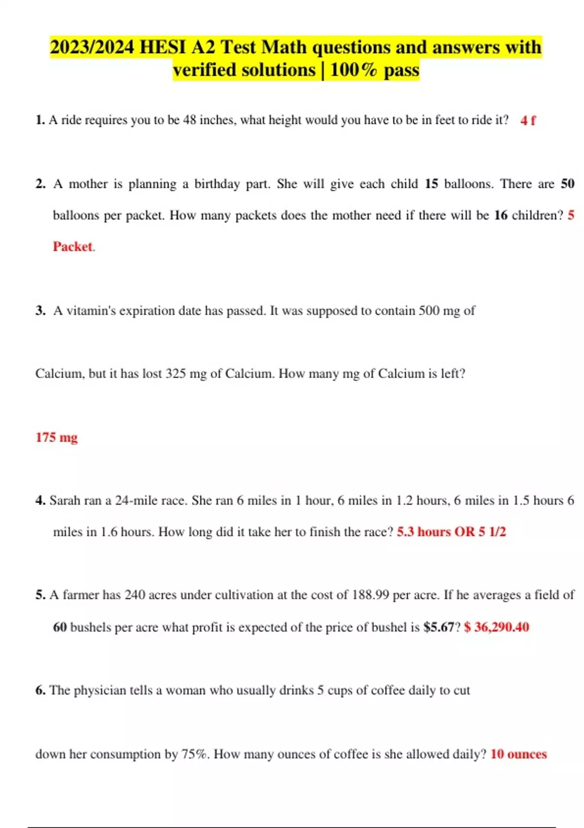 1. A ride requires you to be 48 inches, what height would you have to be in feet to ride it? 4 f 2. A mother is planning a birthday part. She will give each child 15 balloons. There are 50 balloons per packet. How many packets does the mother need if there will be 16 children? 5 Packet. 3. A vitamin's expiration date has passed. It was supposed to contain 500 mg of Calcium, but it has lost 325 mg of Calcium. How many mg of Calcium is left? 175 mg 4. Sarah ran a 24-mile race. She ran 6 miles in 1 hour, 6 miles in 1.2 hours, 6 miles in 1.5 hours 6 miles in 1.6 hours. How long did it take her to finish the race? 5.3 hours OR 5 1/2 5. A farmer has 240 acres under cultivation at the cost of 188.99 per acre. If he averages a field of 60 bushels per acre what profit is expected of the price of bushel is $5.67? $ 36,290.40