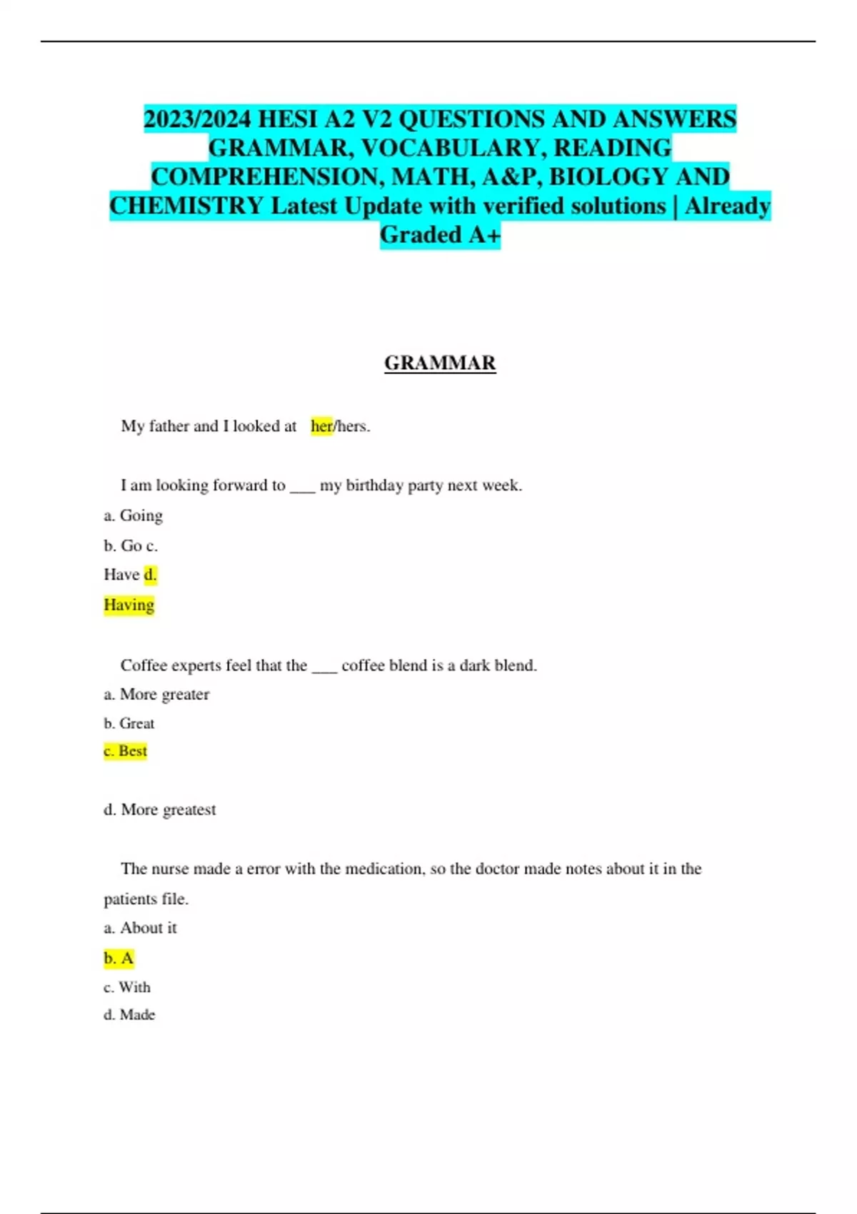 My father and I looked at her/hers. I am looking forward to ___ my birthday party next week. a. Going b. Go c. Have d. Having Coffee experts feel that the ___ coffee blend is a dark blend. a. More greater b. Great c. Best d. More greatest The nurse made a error with the medication, so the doctor made notes about it in the patients file. a. About it b. A c. With d. Made Finishing ___ isn’t as important as answering correctly. Quick As quick So quickist Quickly