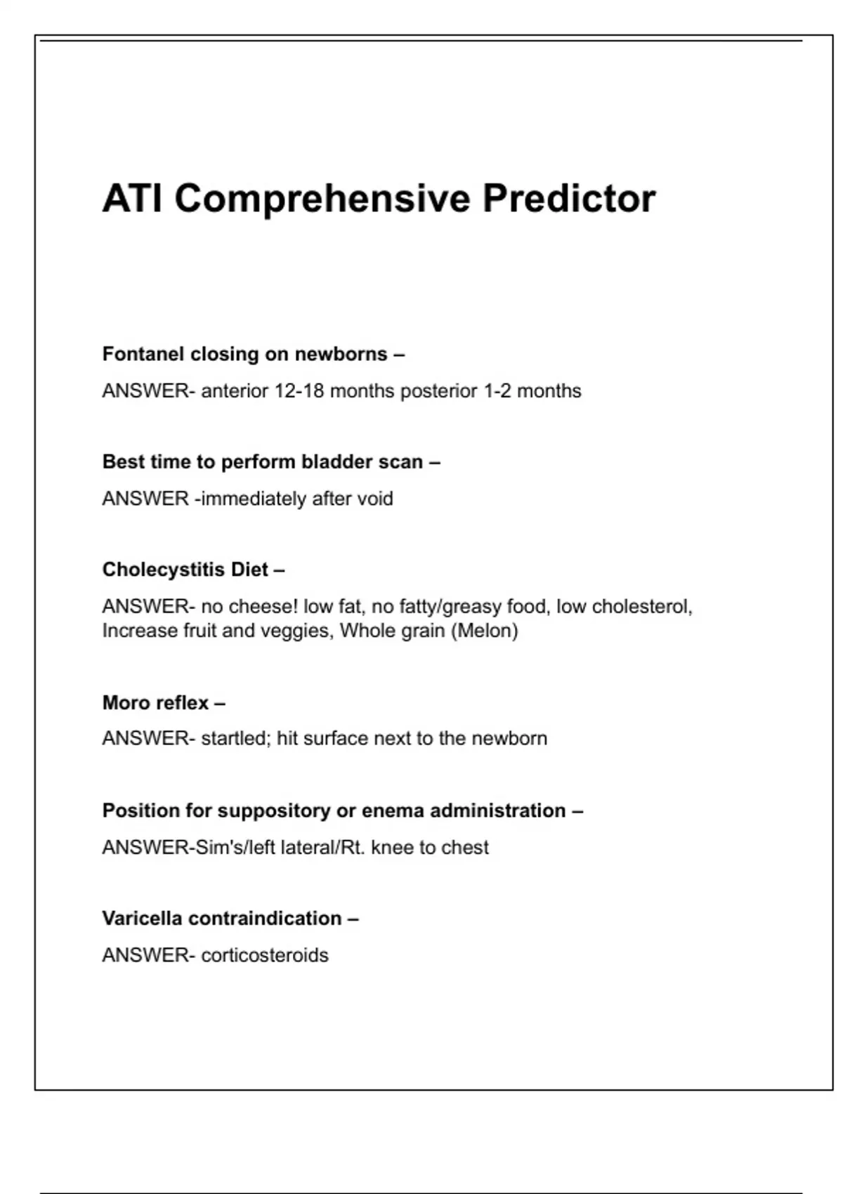 ATI Comprehensive PredictorATI Comprehensive Predictor Fontanel closing on newborns – ANSWER- anterior 12-18 months posterior 1-2 months Best time to perform bladder scan – ANSWER -immediately after void Cholecystitis Diet – ANSWER- no cheese! low fat, no fatty/greasy food, low cholesterol, Increase fruit and veggies, Whole grain (Melon) Moro reflex – ANSWER- startled; hit surface next to the newborn Position for suppository or enema administration – ANSWER-Sim's/left lateral/Rt. knee to chest Varicella contraindication – ANSWER- corticosteroids Dtap contraindication – ANSWER- Hx of inconsolable
