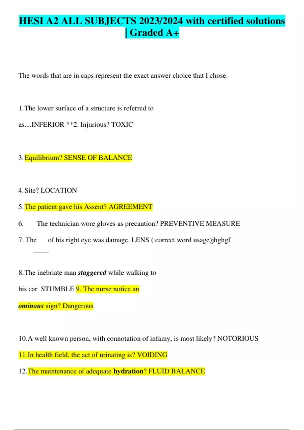 The words that are in caps represent the exact answer choice that I chose. 1.The lower surface of a structure is referred to as....INFERIOR **2. Injurious? TOXIC 3.Equilibrium? SENSE OF BALANCE 4.Site? LOCATION 5.The patient gave his Assent? AGREEMENT 6. The technician wore gloves as precaution? PREVENTIVE MEASURE 7. The of his right eye was damage. LENS ( correct word usage)jhghgf 8.The inebriate man staggered while walking to his car. STUMBLE 9. The nurse notice an ominous sign? Dangerous 10.A well known person, with connotation of infamy, is most likely? NOTORIOUS 11.In health field, the act of urinating is? VOIDING 12.The maintenance of adequate hydration? FLUID BALANCE