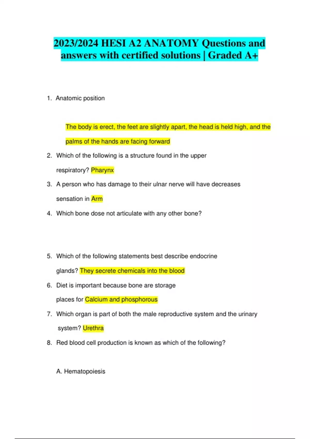 1. Anatomic position The body is erect, the feet are slightly apart, the head is held high, and the palms of the hands are facing forward 2. Which of the following is a structure found in the upper respiratory? Pharynx 3. A person who has damage to their ulnar nerve will have decreases sensation in Arm 4. Which bone dose not articulate with any other bone? 5. Which of the following statements best describe endocrine glands? They secrete chemicals into the blood 6. Diet is important because bone are storage places for Calcium and phosphorous 7. Which organ is part of both the male reproductive system and the urinary system? Urethra 8. Red blood cell production is known as which of the following?