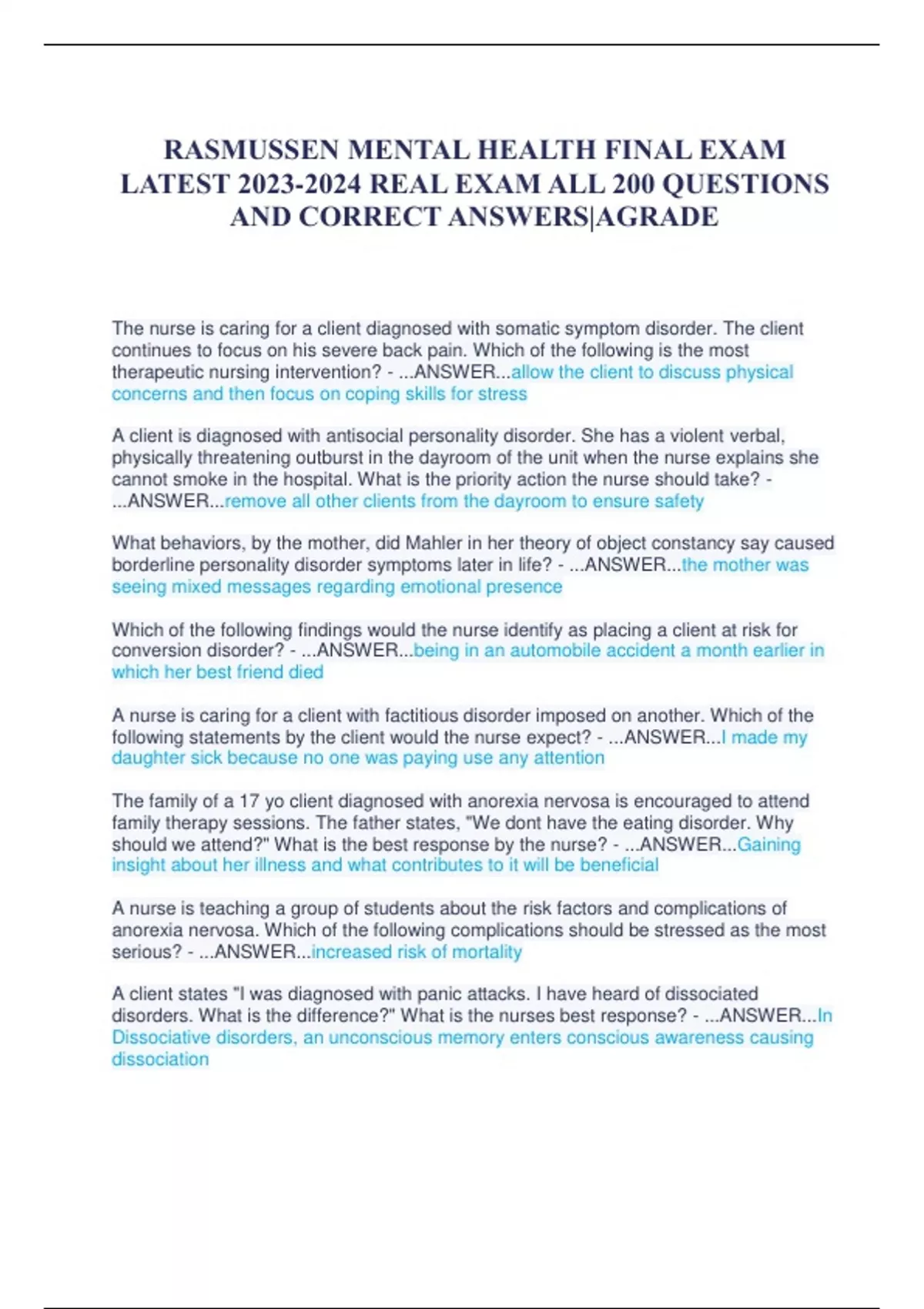 RASMUSSEN MENTAL HEALTH FINAL EXAM LATEST REAL EXAM ALL 200 QUESTIONS AND CORRECT ANSWERS|AGRADE