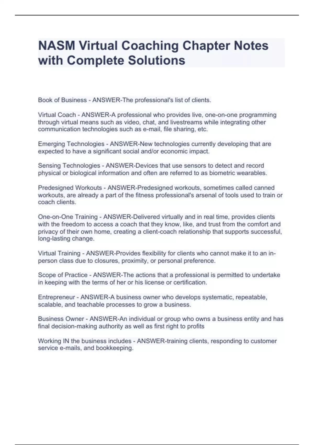 NASM Virtual Coaching Chapter Notes with Complete Solutions NASM Virtual Coaching Chapter Notes with Complete Solutions NASM Virtual Coaching Chapter Notes with Complete Solutions Book of Business - ANSWER-The professional's list of clients. Virtual Coach - ANSWER-A professional who provides live, one-on-one programming through virtual means such as video, chat, and livestreams while integrating other communication technologies such as e-mail, file sharing, etc. Emerging Technologies - ANSWER-New technologies currently developing that are expected to have a significant social and/or economic impact. Sensing Technologies - ANSWER-Devices that use sensors to detect and record physical or biological information and often are referred to as biometric wearables. Predesigned Workouts - ANSWER-Predesigned workouts, sometimes called canned workouts, are already a part of the fitness professional's arsenal of tools used to train or coach clients.