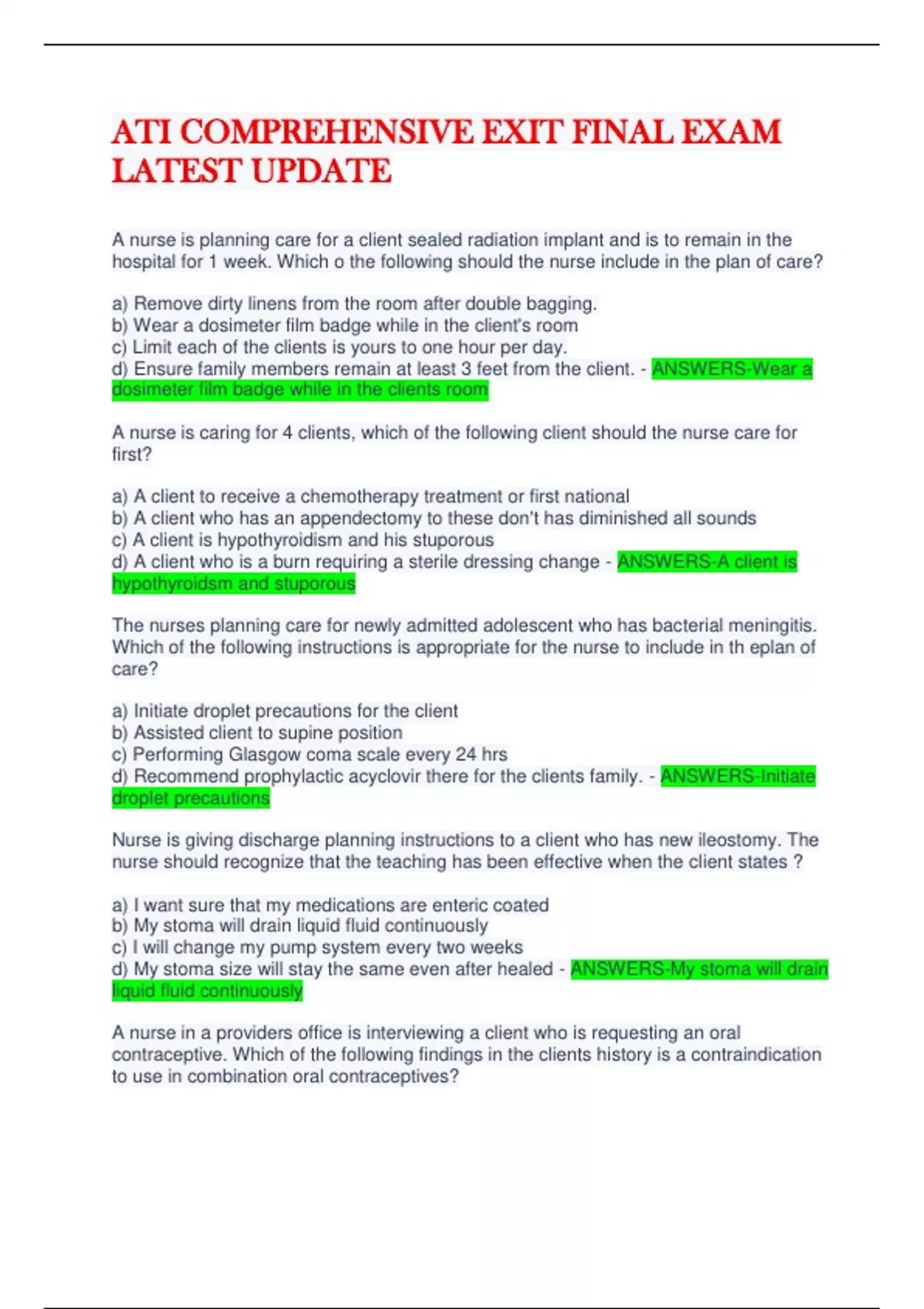 ATI COMPREHENSIVE EXIT FINAL EXAM LATEST UPDATE A nurse is planning care for a client sealed radiation implant and is to remain in the hospital for 1 week. Which o the following should the nurse include in the plan of care? a) Remove dirty linens from the room after double bagging. b) Wear a dosimeter film badge while in the client's room c) Limit each of the clients is yours to one hour per day. d) Ensure family members remain at least 3 feet from the client. - ANSWERS-Wear a dosimeter film badge while in the clients room A nurse is caring for 4 clients, which of the following client should the nurse care for first? a) A client to receive a chemotherapy treatment or first national b) A client who has an appendectomy to these don't has diminished all sounds c) A client is hypothyroidism and his stuporous d) A client who is a burn requiring a sterile dressing change - ANSWERS-A client is hypothyroidsm and stuporous The nurses planning care for newly admitted adolescent who has bacterial meningitis. Which of the following instructions is appropriate for the nurse to include in th eplan of care? a) Initiate droplet precautions for the client b) Assisted client to supine position c) Performing Glasgow coma scale every 24 hrs d) Recommend prophylactic acyclovir there for the clients family. - ANSWERS-Initiate droplet precautions Nurse is giving discharge planning instructions to a client who has new ileostomy. The nurse should recognize that the teaching has been effective when the client states ? a) I want sure that my medications are enteric coated b) My stoma will drain liquid fluid continuously c) I will change my pump system every two weeks d) My stoma size will stay the same even after healed - ANSWERS-My stoma will drain liquid fluid continuously A nurse in a providers office is interviewing a client who is requesting an oral contraceptive. Which of the following findings in the clients history is a contraindication to use in combination oral contraceptives? a) thyroid disease b) Allergy to penicillin c) impaired liver function d) abnormal blood glucose - ANSWERS-Impaired liver function The nurses providing teaching to a client who has mild persistent asthma has been prescribed montelukast. Which of the following statements should the nurse state for the teaching? a) This medication can be used to help you when have an acute asthma attack b) This medication should be taken before exercise and physical activity c) This medication can be taken for 10 days and then gradually discontinued d) This medication helps decrease swelling and mucus production - ANSWERS-This medication helps decrease swelling and mucus production