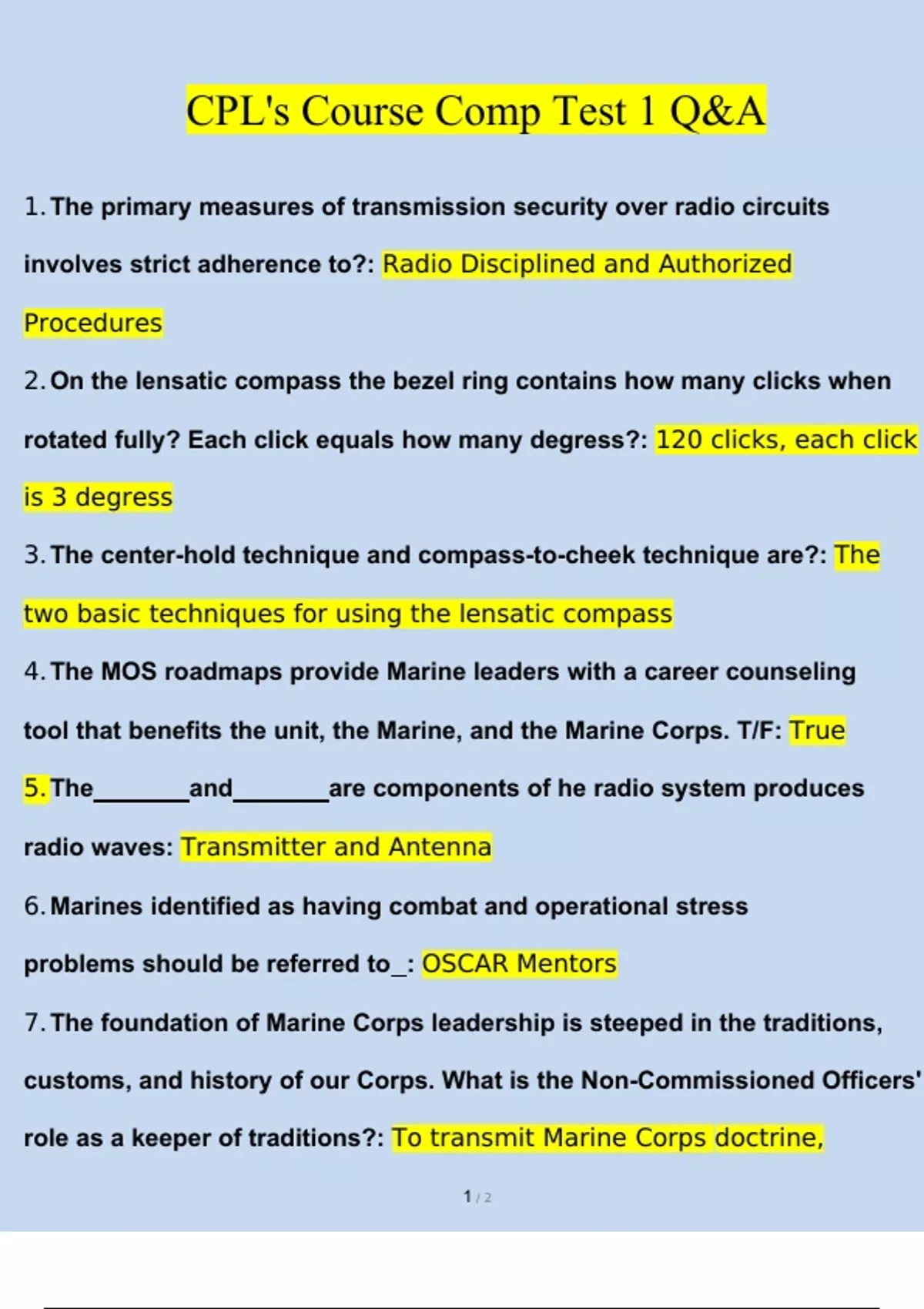 Corporal Course Test 1 ALL BUNDLED Cpls course exam 1, questions and answers 100% correct CORPORALS COURSE COMP 2 TEST REVIEW