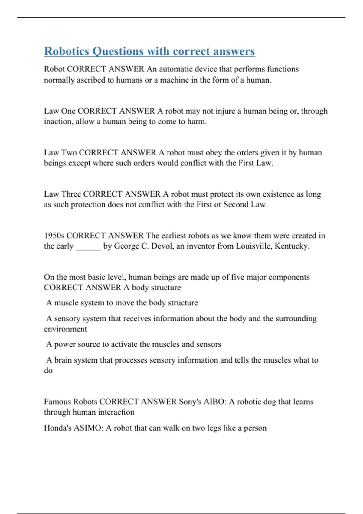 Robot CORRECT ANSWER An automatic device that performs functions normally ascribed to humans or a machine in the form of a human. Law One CORRECT ANSWER A robot may not injure a human being or, through inaction, allow a human being to come to harm. Law Two CORRECT ANSWER A robot must obey the orders given it by human beings except where such orders would conflict with the First Law. Law Three CORRECT ANSWER A robot must protect its own existence as long as such protection does not conflict with the First or Second Law. 1950s CORRECT ANSWER The earliest robots as we know them were created in the early ______ by George C. Devol, an inventor from Louisville, Kentucky. On the most basic level, human beings are made up of five major components CORRECT ANSWER A body structure A muscle system to move the body structure A sensory system that receives information about the body and the surrounding environment A power source to activate the muscles and sensors A brain system that processes sensory information and tells the muscles what to do Famous Robots CORRECT ANSWER Sony's AIB