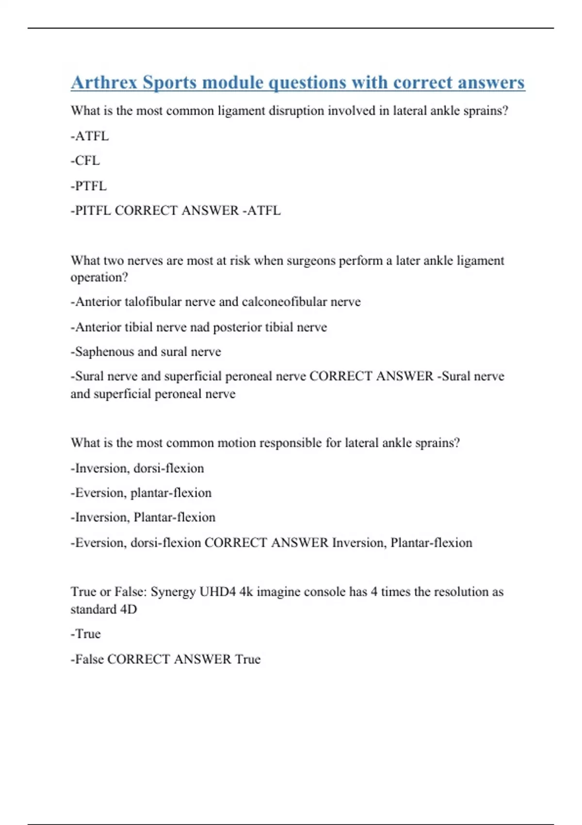 What is the most common ligament disruption involved in lateral ankle sprains? -ATFL -CFL -PTFL -PITFL CORRECT ANSWER -ATFL What two nerves are most at risk when surgeons perform a later ankle ligament operation? -Anterior talofibular nerve and calconeofibular nerve -Anterior tibial nerve nad posterior tibial nerve -Saphenous and sural nerve -Sural nerve and superficial peroneal nerve CORRECT ANSWER -Sural nerve and superficial peroneal nerve What is the most common motion responsible for lateral ankle sprains? -Inversion, dorsi-flexion -Eversion, plantar-flexion -Inversion, Plantar-flexion -Eversion, dorsi-flexion CORRECT ANSWER Inversion, Plantar-flexion True or False: Synergy UHD4 4k imagine console has 4 times the resolution as standard 4D -True -False CORRECT ANSWER True