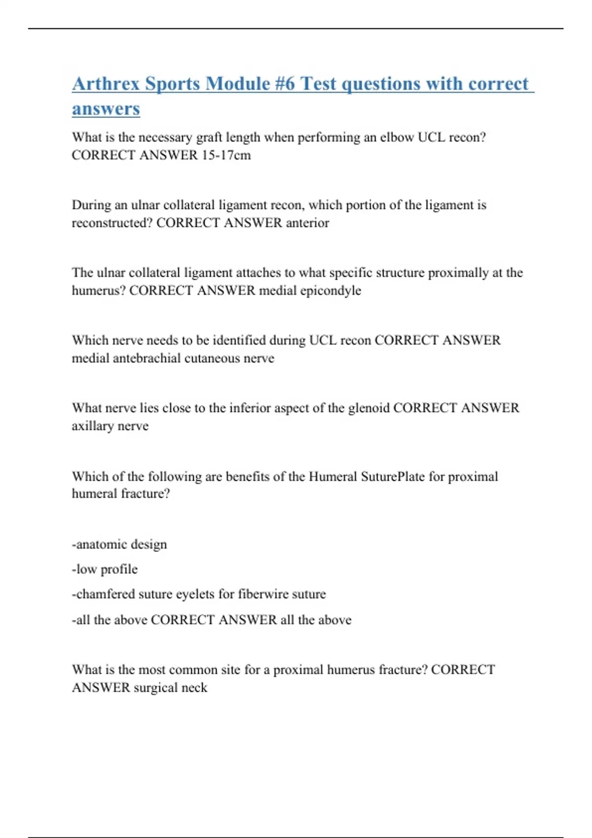 What is the necessary graft length when performing an elbow UCL recon? CORRECT ANSWER 15-17cm During an ulnar collateral ligament recon, which portion of the ligament is reconstructed? CORRECT ANSWER anterior The ulnar collateral ligament attaches to what specific structure proximally at the humerus? CORRECT ANSWER medial epicondyle Which nerve needs to be identified during UCL recon CORRECT ANSWER medial antebrachial cutaneous nerve What nerve lies close to the inferior aspect of the glenoid CORRECT ANSWER axillary nerve Which of the following are benefits of the Humeral SuturePlate for proximal humeral fracture? -anatomic design -low profile -chamfered suture eyelets for fiberwire suture -all the above CORRECT ANSWER all the above What is the most common site for a proximal humerus fracture? CORRECT ANSWER surgical neck