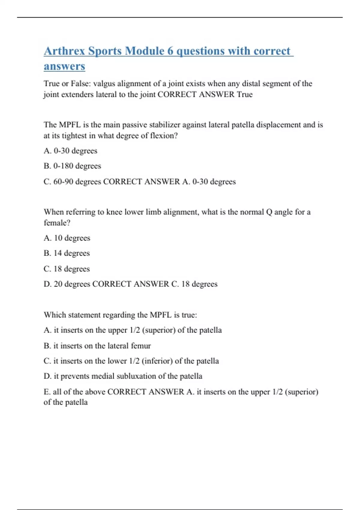 True or False: valgus alignment of a joint exists when any distal segment of the joint extenders lateral to the joint CORRECT ANSWER True The MPFL is the main passive stabilizer against lateral patella displacement and is at its tightest in what degree of flexion? A. 0-30 degrees B. 0-180 degrees C. 60-90 degrees CORRECT ANSWER A. 0-30 degrees When referring to knee lower limb alignment, what is the normal Q angle for a female? A. 10 degrees B. 14 degrees C. 18 degrees D. 20 degrees CORRECT ANSWER C. 18 degrees Which statement regarding the MPFL is true: A. it inserts on the upper 1/2 (superior) of the patella B. it inserts on the lateral femur C. it inserts on the lower 1/2 (inferior) of the pat