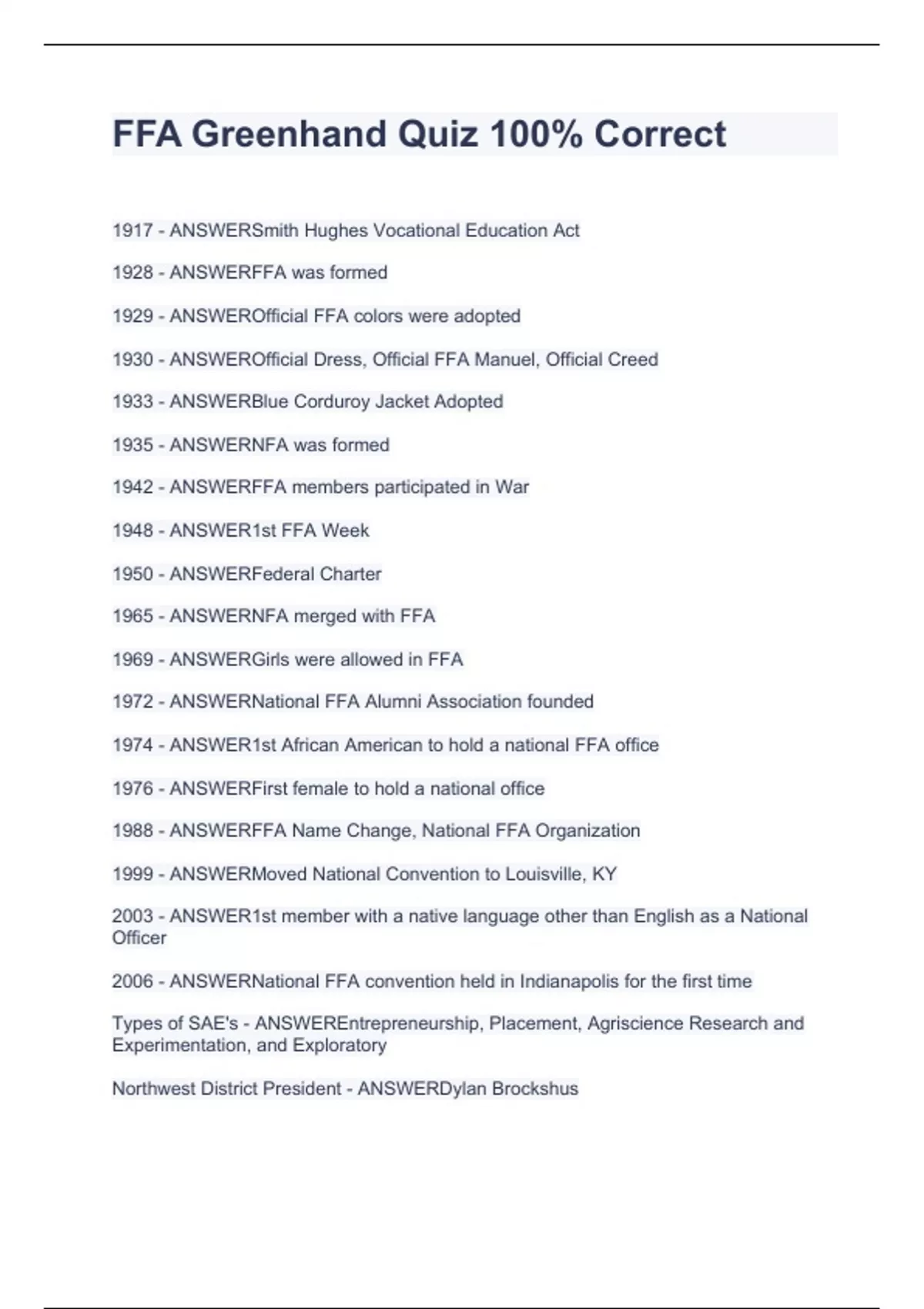 1917 - ANSWERSmith Hughes Vocational Education Act 1928 - ANSWERFFA was formed 1929 - ANSWEROfficial FFA colors were adopted 1930 - ANSWEROfficial Dress, Official FFA Manuel, Official Creed 1933 - ANSWERBlue Corduroy Jacket Adopted 1935 - ANSWERNFA was formed 1942 - ANSWERFFA members participated in War 1948 - ANSWER1st FFA Week 1950 - ANSWERFederal Charter 1965 - ANSWERNFA merged with FFA 1969 - ANSWERGirls were allowed in FFA 1972 - ANSWERNational FFA Alumni Association founded 1974 - ANSWER1st African American to hold a national FFA office 1976 - ANSWERFirst female to hold a national office 1988 - ANSWERFFA Name Change, National FFA Organization 1999 - ANSWERMoved National Convention to Louisville, KY 2003 - ANSWER1st member with a native language other than English as a National Officer 2006 - ANSWERNational FFA convention held in Indianapolis for the first time Types of SAE's - ANSWEREntrepreneurship, Placement, Agriscience Research and Experimentation, and Exploratory Northwest District President - ANSWERDylan Brockshus Northwest District Vice-President - ANSWERDevan Vander Veen Northwest District Secretary - ANSWERRebecca Lair Northwest District Treasurer - ANSWERKatie Goodell Northwest District Sentinel - ANSWERHunter East Northwest District Reporter - ANSWERMarissa Pham Northwest District Advisor - ANSWERMr. Doug Gaul State President - ANSWERJosh Earll State Secretary - ANSWERAbrah Meyer 1917 - ANSWERSmith Hughes Vocational Education Act 1928 - ANSWERFFA was formed 1929 - ANSWEROfficial FFA colors were adopted 1930 - ANSWEROfficial Dress, Official FFA Manuel, Official Creed 1933 - ANSWERBlue Corduroy Jacket Adopted 1935 - ANSWERNFA was formed 1942 - ANSWERFFA members participated in War 1948 - ANSWER1st FFA Week 1950 - ANSWERFederal Charter 1965 - ANSWERNFA merged with FFA 1969 - ANSWERGirls were allowed in FFA 1972 - ANSWERNational FFA Alumni Association founded 1974 - ANSWER1st African American to hold a national FFA office 1976 - ANSWERFirst female to hold a national office 1988 - ANSWERFFA Name Change, National FFA Organization 1999 - ANSWERMoved National Convention to Louisville, KY 2003 - ANSWER1st member with a native language other than English as a National Officer 2006 - ANSWERNational FFA convention held in Indianapolis for the first time Types of SAE's - ANSWEREntrepreneurship, Placement, Agriscience Research and Experimentation, and Exploratory Northwest District President - ANSWERDylan Brockshus Northwest District Vice-President - ANSWERDevan Vander Veen Northwest District Secretary - ANSWERRebecca Lair Northwest District Treasurer - ANSWERKatie Goodell Northwest District Sentinel - ANSWERHunter East Northwest District Reporter - ANSWERMarissa Pham Northwest District Advisor - ANSWERMr. Doug Gaul State President - ANSWERJosh Earll State Secretary - ANSWERAbrah Meyer 1917 - ANSWERSmith Hughes Vocational Education Act 1928 - ANSWERFFA was formed 1929 - ANSWEROfficial FFA colors were adopted 1930 - ANSWEROfficial Dress, Official FFA Manuel, Official Creed 1933 - ANSWERBlue Corduroy Jacket Adopted 1935 - ANSWERNFA was formed 1942 - ANSWERFFA members participated in War 1948 - ANSWER1st FFA Week 1950 - ANSWERFederal Charter 1965 - ANSWERNFA merged with FFA 1969 - ANSWERGirls were allowed in FFA 1972 - ANSWERNational FFA Alumni Association founded 1974 - ANSWER1st African American to hold a national FFA office 1976 - ANSWERFirst female to hold a national office 1988 - ANSWERFFA Name Change, National FFA Organization 1999 - ANSWERMoved National Convention to Louisville, KY 2003 - ANSWER1st member with a native language other than English as a National Officer 2006 - ANSWERNational FFA convention held in Indianapolis for the first time Types of SAE's - ANSWEREntrepreneurship, Placement, Agriscience Research and Experimentation, and Exploratory Northwest District President - ANSWERDylan Brockshus Northwest District Vice-President - ANSWERDevan Vander Veen Northwest District Secretary - ANSWERRebecca Lair Northwest District Treasurer - ANSWERKatie Goodell Northwest District Sentinel - ANSWERHunter East Northwest District Reporter - ANSWERMarissa Pham Northwest District Advisor - ANSWERMr. Doug Gaul State President - ANSWERJosh Earll State Secretary - ANSWERAbrah Meyer 1917 - ANSWERSmith Hughes Vocational Education Act 1928 - ANSWERFFA was formed 1929 - ANSWEROfficial FFA colors were adopted 1930 - ANSWEROfficial Dress, Official FFA Manuel, Official Creed 1933 - ANSWERBlue Corduroy Jacket Adopted 1935 - ANSWERNFA was formed 1942 - ANSWERFFA members participated in War 1948 - ANSWER1st FFA Week 1950 - ANSWERFederal Charter 1965 - ANSWERNFA merged with FFA 1969 - ANSWERGirls were allowed in FFA 1972 - ANSWERNational FFA Alumni Association founded 1974 - ANSWER1st African American to hold a national FFA office 1976 - ANSWERFirst female to hold a national office 1988 - ANSWERFFA Name Change, National FFA Organization 1999 - ANSWERMoved National Convention to Louisville, KY 2003 - ANSWER1st member with a native language other than English as a National Officer 2006 - ANSWERNational FFA convention held in Indianapolis for the first time Types of SAE's - ANSWEREntrepreneurship, Placement, Agriscience Research and Experimentation, and Exploratory Northwest District President - ANSWERDylan Brockshus Northwest District Vice-President - ANSWERDevan Vander Veen Northwest District Secretary - ANSWERRebecca Lair Northwest District Treasurer - ANSWERKatie Goodell Northwest District Sentinel - ANSWERHunter East Northwest District Reporter - ANSWERMarissa Pham Northwest District Advisor - ANSWERMr. Doug Gaul State President - ANSWERJosh Earll State Secretary - ANSWERAbrah Meyer 1917 - ANSWERSmith Hughes Vocational Education Act 1928 - ANSWERFFA was formed 1929 - ANSWEROfficial FFA colors were adopted 1930 - ANSWEROfficial Dress, Official FFA Manuel, Official Creed 1933 - ANSWERBlue Corduroy Jacket Adopted 1935 - ANSWERNFA was formed 1942 - ANSWERFFA members participated in War 1948 - ANSWER1s