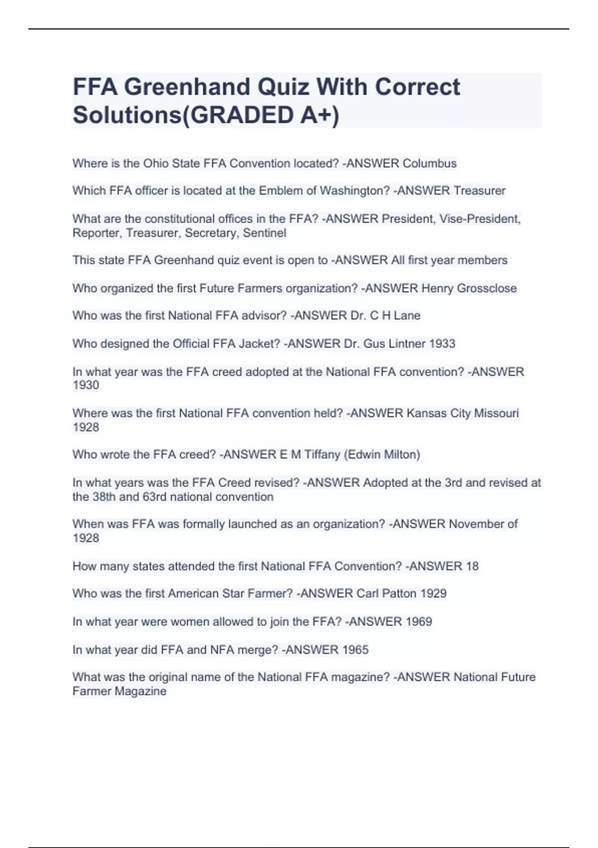 FFA Greenhand Quiz With Correct Solutions(GRADED A+)