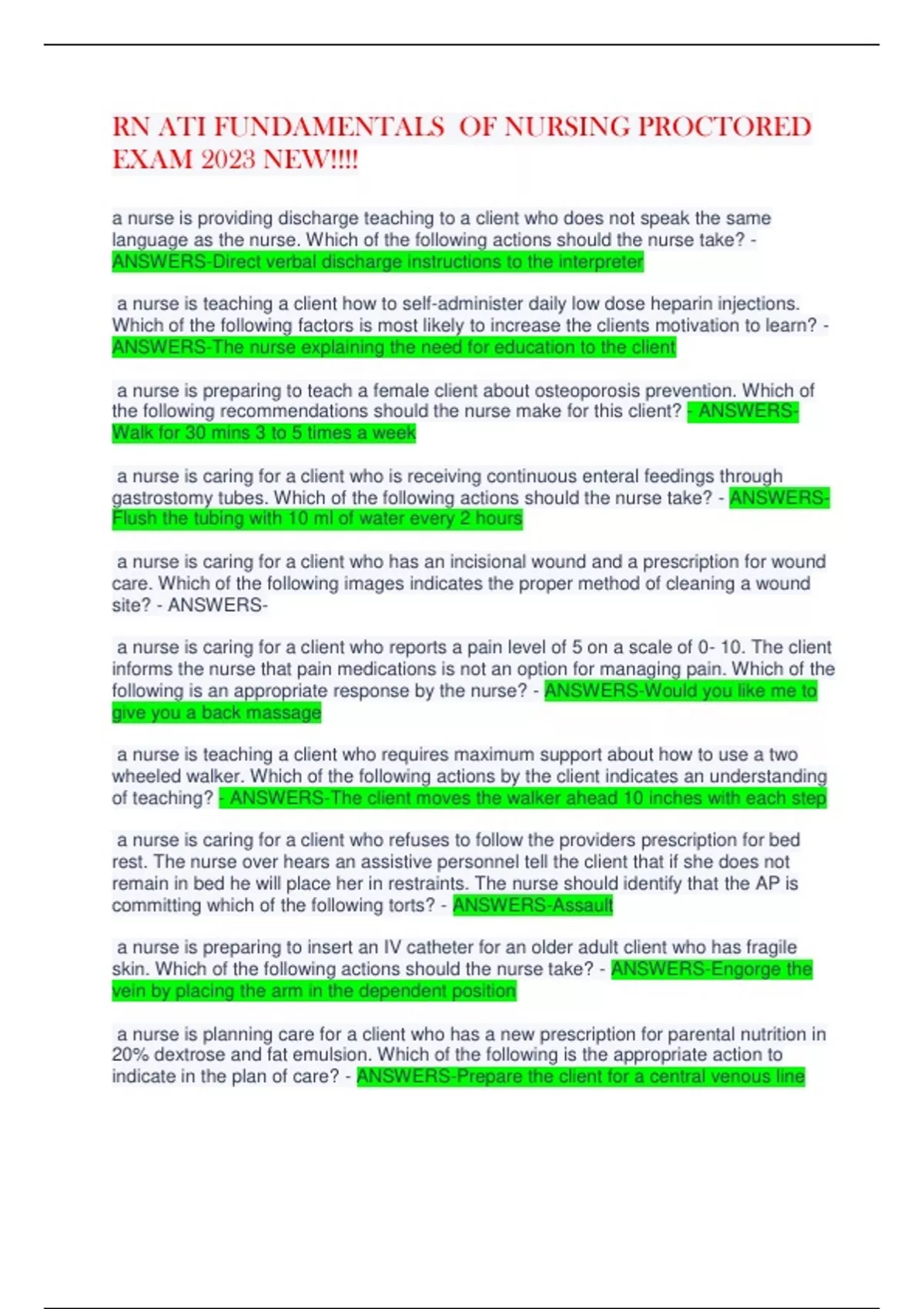 RN ATI FUNDAMENTALS OF NURSING PROCTORED EXAM 2023 NEW!!!! a nurse is providing discharge teaching to a client who does not speak the same language as the nurse. Which of the following actions should the nurse take? - ANSWERS-Direct verbal discharge instructions to the interpreter a nurse is teaching a client how to self-administer daily low dose heparin injections. Which of the following factors is most likely to increase the clients motivation to learn? - ANSWERS-The nurse explaining the need for education to the client a nurse is preparing to teach a female client about osteoporosis prevention. Which of the following recommendations should the nurse make for this client? - ANSWERSWalk for 30 mins 3 to 5 times a week a nurse is caring for a client who is receiving continuous enteral feedings through gastrostomy tubes. Which of the following actions should the nurse take? - ANSWERSFlush the tubing with 10 ml of water every 2 hours a nurse is caring for a client who has an incisional wound and a prescription for wound care. Which of the following images indicates the proper method of cleaning a wound site? - ANSWERSa nurse is caring for a client who reports a pain level of 5 on a scale of 0- 10. The client informs the nurse that pain medications is not an option for managing pain. Which of the following is an appropriate response by the nurse? - ANSWERS-Would you like me to give you a back massage a nurse is teaching a client who requires maximum support about how to use a two wheeled walker. Which of the following actions by the client indicates an understanding of teaching? - ANSWERS-The client moves the walker ahead 10 inches with each step a nurse is caring for a client who refuses to follow the providers prescription for bed rest. The nurse over hears an assistive personnel tell the client that if she does not remain in bed he will place her in restraints. The nurse should identify that the AP is committing which of the following torts? - ANSWERS-Assault a nurse is preparing to insert an IV catheter for an older adult client who has fragile skin. Which of the following actions should the nurse take? - ANSWERS-Engorge the vein by placing the arm in the dependent position a nurse is planning care for a client who has a new prescription for parental nutrition in 20% dextrose and fat emulsion. Which of the following is the appropriate action to indicate in the plan of care? - ANSWERS-Prepare the client for a central venous line a nurse is caring for a client who is schedule for surgery while witnessing the client signature. While the client is saying I trust my doctor, but I don't understand what he meant when he said he'll reset my intestines. Which of the following actions should the nurse take? - ANSWERS-Notify the provider a nurse is caring for a client who is agitated and threatening to harm others. The nurse places the client in restraints but does not notify the provider or obtain a prescription for the restraints. The situation respects which of the following torts? - ANSWERS-False imprisonment a nurse is conducting a Webber test on a client. Which of the following is an appropriate action for the nurse to take? - ANSWERS-Place an activated tuning fork in the middle of the clients forehead a nurse Is caring for a client who is 6 hours postoperative abdominal surgery and who is having difficulty voiding. Which of the following actions should the nurse take? - ANSWERS-Encourage fluid intake up to 1000 ml daily a nurse is preparing to use the Z track method to administer iron dextran to a client who has an iron deficiency anemia. The client asks why this method of injection is necessary. Which of the following responses should the nurse make? - ANSWERS-It minimizes tissue irritation a nurse on a medical unit is caring for a group of client's for which of the following tasks should the nurse wear a face shield? - ANSWERS-Suctioning a clients tracheostomy tube an adult client tells a nurse about recent lack of sleep due to changing to a night shift job. Which of the following interventions should the nurse suggest? - ANSWERS-Listen to soft music before lying down a nurse is teaching a group of newly licensed nurses about the Braden scale. Which of the following responses by a newly licensed nurse indicates understanding in the teaching? - ANSWERS-The scale measures six elements a nurse is planning care for client who is scheduled for an intravenous pyelogram. Which of the following actions is appropriate for the nurse to include? - ANSWERSEnsure the client is free of medal objects a nurse in a long term care facility is planning care for 4 client's. which of the following client's is at greatest risk of developing a pressure ulcer? - ANSWERS-Client who is unresponsive to pain stimuli a nurse is preparing to perform a sterile dressing change for a client. Which of the following actions should the nurse plan to take? - ANSWERS-Setup the sterile field above the waist level