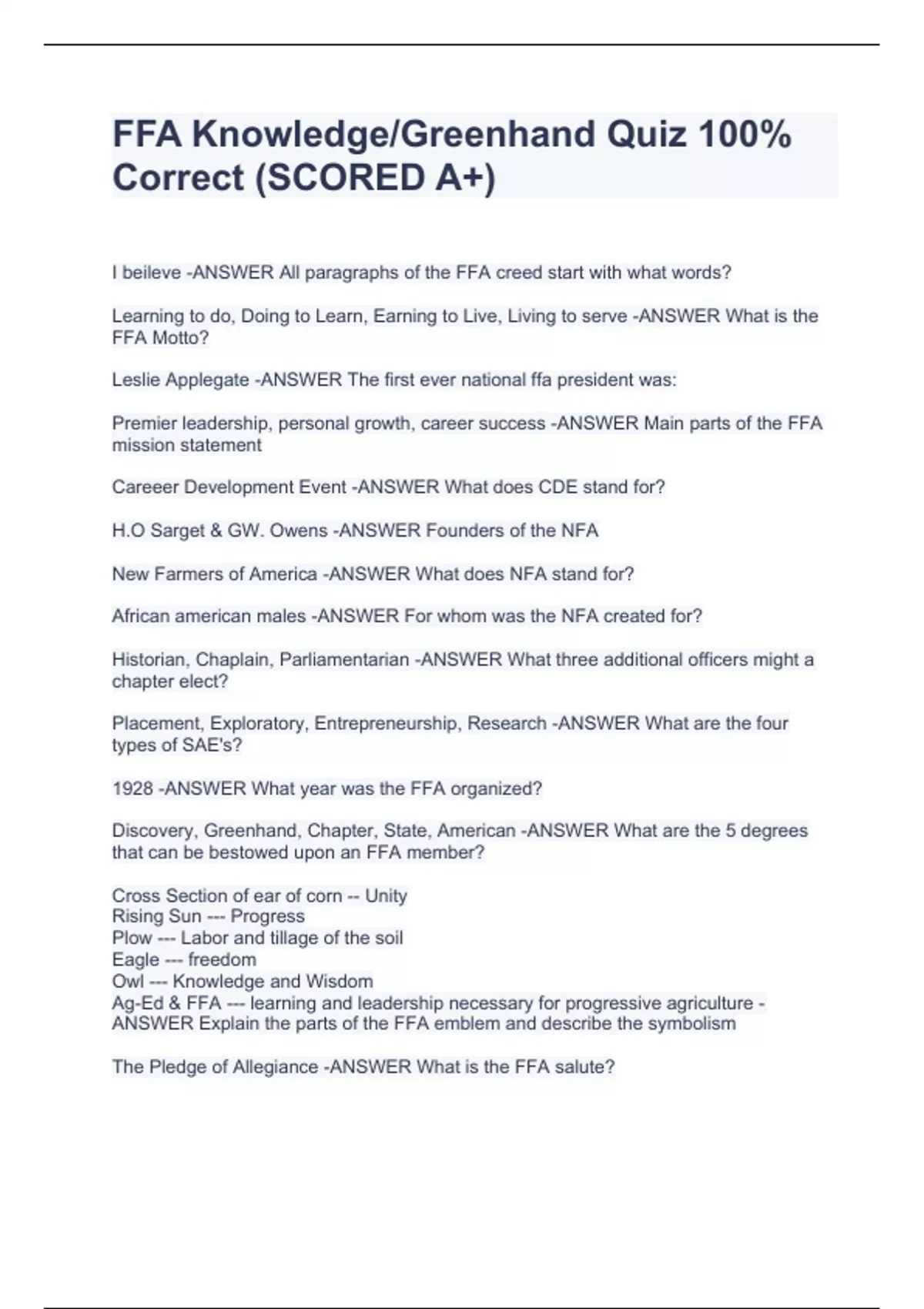 FFA Knowledge/Greenhand Quiz 100% Correct (SCORED A+)