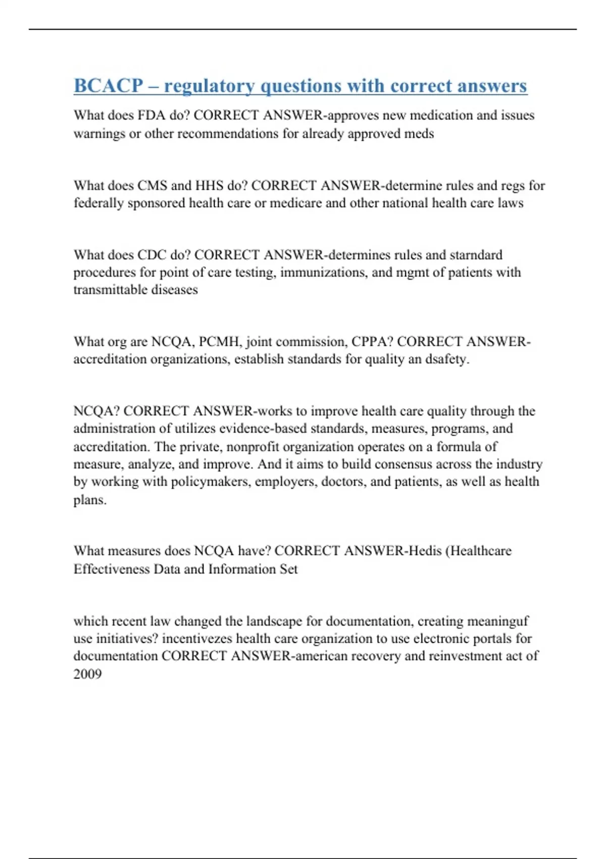 What does FDA do? CORRECT ANSWER-approves new medication and issues warnings or other recommendations for already approved meds What does CMS and HHS do? CORRECT ANSWER-determine rules and regs for federally sponsored health care or medicare and other national health care laws What does CDC do? CORRECT ANSWER-determines rules and starndard procedures for point of care testing, immunizations, and mgmt of patients with transmittable diseases What org are NCQA, PCMH, joint commission, CPPA? CORRECT ANSWER-accreditation organizations, establish standards for quality an dsafety. NCQA? CORRECT ANSWER-works to improve health care quality through the administration of utilizes evidence-based standards, measures, programs, and accreditation. The private, nonprofit organization operates on a formula of measure, analyze, and improve. And it aims to build consensus across the industry by working with policymakers, employers, doctors, and patients, as well as health plans. What measures does NCQA have? CORRECT ANSWER-Hedis (Healthcare Effectiveness Data and Information Set which recent law changed the landscape for documentation, creating meaninguf use initiatives? incentivezes health care organization to use electronic portals for documentation CORRECT ANSWER-american recovery and reinvestment act of 2009