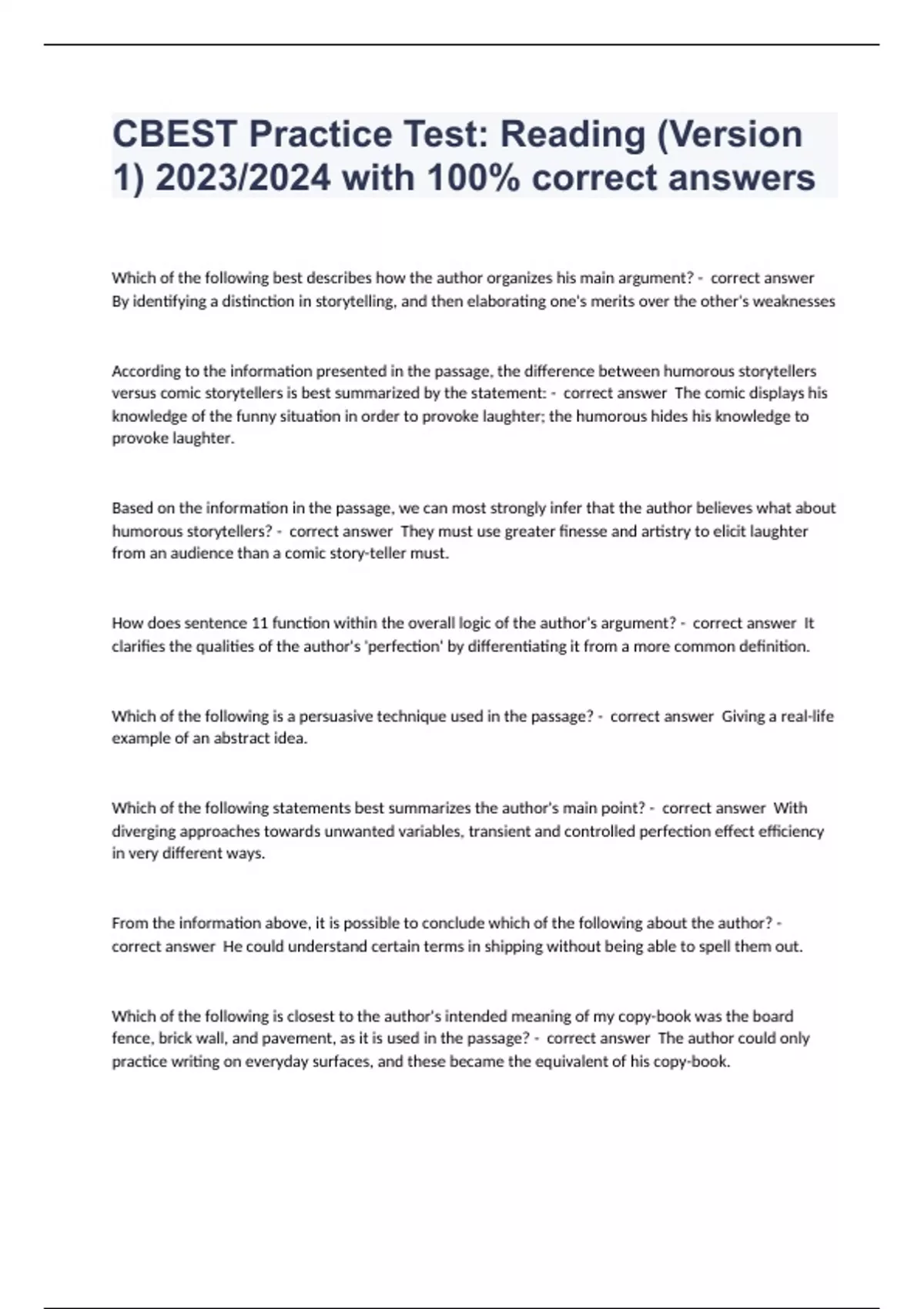 Which of the following best describes how the author organizes his main argument? - correct answer By identifying a distinction in storytelling, and then elaborating one's merits over the other's weaknesses According to the information presented in the passage, the difference between humorous storytellers versus comic storytellers is best summarized by the statement: - correct answer The comic displays his knowledge of the funny situation in order to provoke laughter; the humorous hides his knowledge to provoke laughter. Based on the information in the passage, we can most strongly infer that the author believes what about humorous storytellers? - correct answer They must use greater finesse and artistry to elicit laughter from an audience than a comic story-teller must. How does sentence 11 function within the overall logic of the author's argument? - correct answer It clarifies the qualities of the author's 'perfection' by differentiating it from a more common definition. Which of the following is a persuasive technique used in the passage? - correct answer Giving a real-life example of an abstract idea. Which of the following statements best summarizes the author's main point? - correct answer With diverging approaches towards unwanted variables, transient and controlled perfection effect efficiency in very different ways. From the information above, it is possible to conclude which of the following about the author? - correct answer He could understand certain terms in shipping without being able to spell them out. Which of the following is closest to the author's intended meaning of my copy-book was the board fence, brick wall, and pavement, as it is used in the passage? - correct answer The author could only practice writing on everyday surfaces, and these became the equivalent of his copy-book.