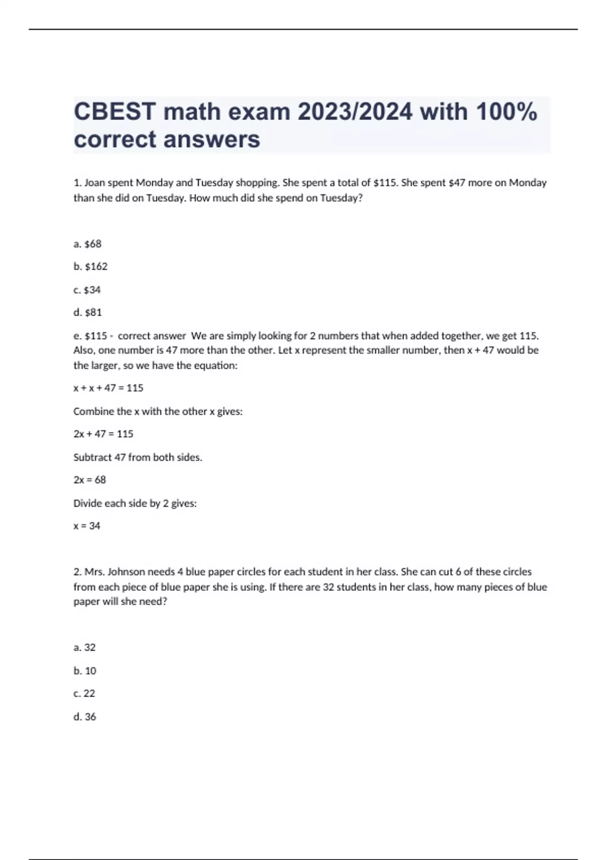 1. Joan spent Monday and Tuesday shopping. She spent a total of $115. She spent $47 more on Monday than she did on Tuesday. How much did she spend on Tuesday? a. $68 b. $162 c. $34 d. $81 e. $115 - correct answer We are simply looking for 2 numbers that when added together, we get 115. Also, one number is 47 more than the other. Let x represent the smaller number, then x + 47 would be the larger, so we have the equation: x + x + 47 = 115 Combine the x with the other x gives: 2x + 47 = 115 Subtract 47 from both sides. 2x = 68 Divide each side by 2 gives: x = 34 2. Mrs. Johnson needs 4 blue paper circles for each student in her class. She can cut 6 of these circles from each piece of blue paper she is using. If there are 32 students in her class, how many pieces of blue paper will she need? a. 32 b. 10 c. 22 d. 36 e. 21 - co
