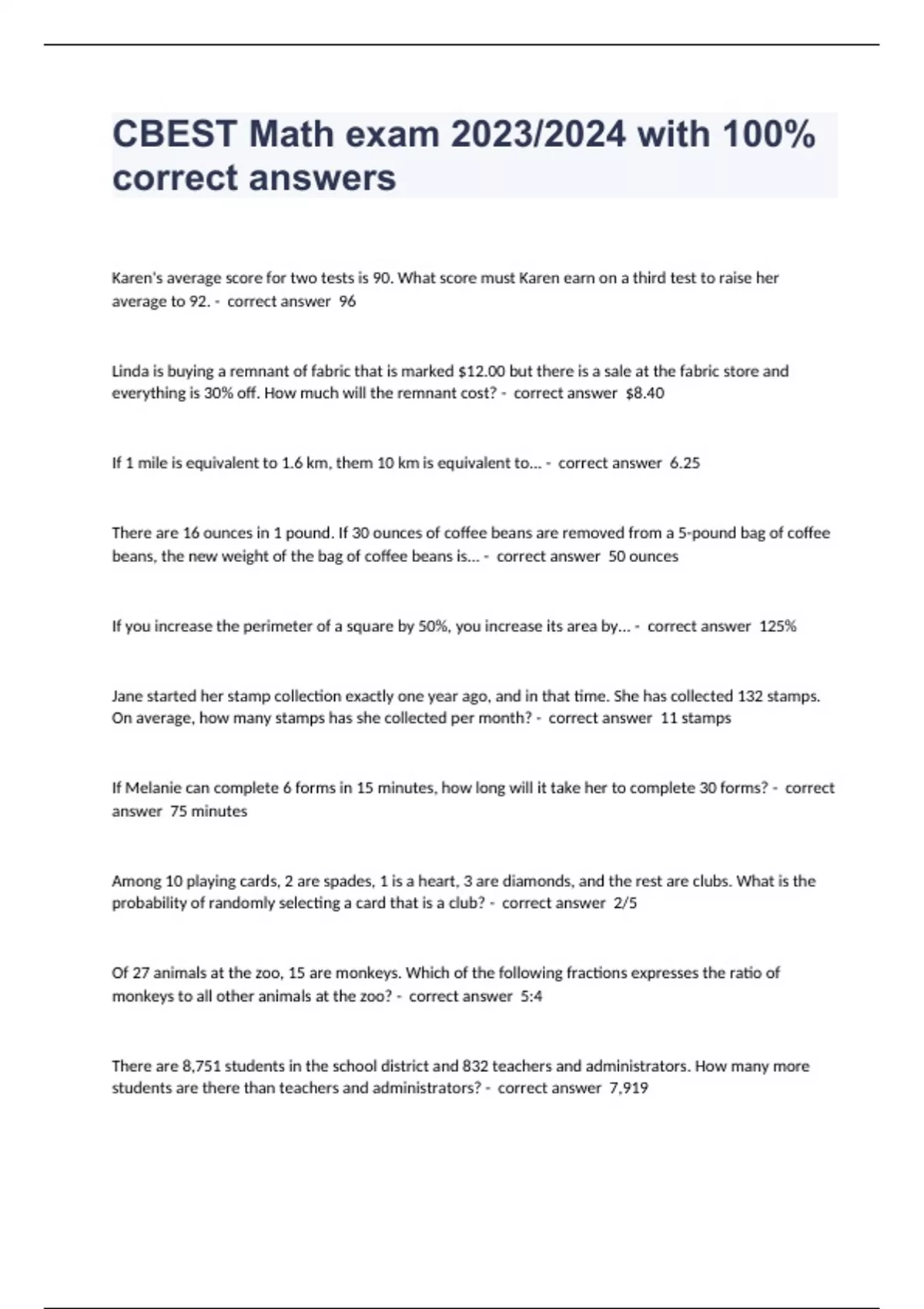 Karen's average score for two tests is 90. What score must Karen earn on a third test to raise her average to 92. - correct answer 96 Linda is buying a remnant of fabric that is marked $12.00 but there is a sale at the fabric store and everything is 30% off. How much will the remnant cost? - correct answer $8.40 If 1 mile is equivalent to 1.6 km, them 10 km is equivalent to... - correct answer 6.25 There are 16 ounces in 1 pound. If 30 ounces of coffee beans are removed from a 5-pound bag of coffee beans, the new weight of the bag of coffee beans is... - correct answer 50 ounces If you increase the perimeter of a square by 50%, you increase its area by... - correct answer 125% Jane started her stamp collection exactly one year ago, and in that time. She has collected 132 stamps. On average, how many stamps has she collected per month? - correct answer 11 stamps If Melanie can complete 6 forms in 15 minutes, how long will it take her to complete 30 forms? - correct answer 75 minutes Among 10 playing cards, 2 are spades, 1 is a heart, 3 are diamonds, and the rest are clubs. What is the probability of randomly selecting a card that is a club? - correct answer 2/5 Of 27 animals at the zoo, 15 are monkeys. Which of the following fractions expresses the ratio of monkeys to all other animals at the zoo? - correct answer 5:4 There are 8,751 students in the school district and 832 teachers and administrators. How many more students are there than teachers and administrators? - correct answer 7,919