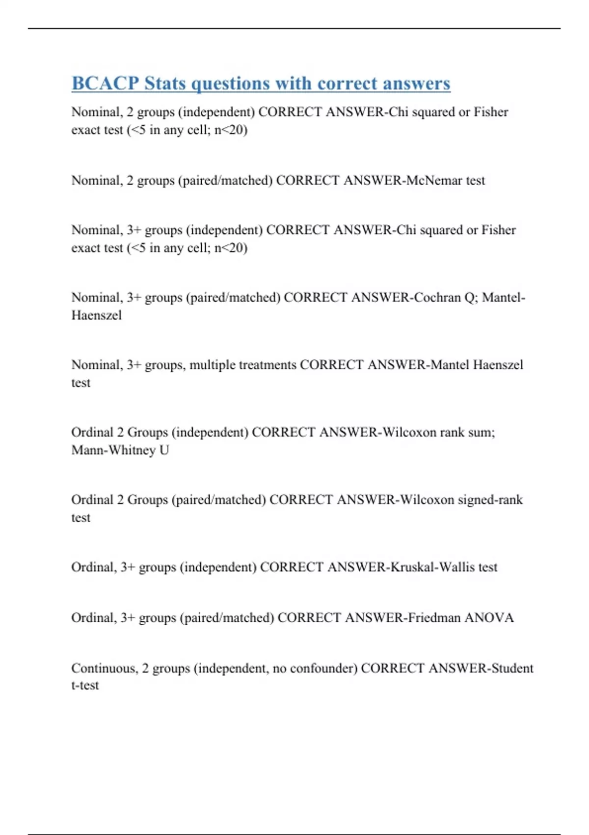 Nominal, 2 groups (independent) CORRECT ANSWER-Chi squared or Fisher exact test (<5 in any cell; n<20) Nominal, 2 groups (paired/matched) CORRECT ANSWER-McNemar test Nominal, 3+ groups (independent) CORRECT ANSWER-Chi squared or Fisher exact test (<5 in any cell; n<20) Nominal, 3+ groups (paired/matched) CORRECT ANSWER-Cochran Q; Mantel-Haenszel Nominal, 3+ groups, multiple treatments CORRECT ANSWER-Mantel Haenszel test Ordinal 2 Groups (independent) CORRECT ANSWER-Wilcoxon rank sum; Mann-Whitney U Ordinal 2 Groups (paired/matched) CORRECT ANSWER-Wilcoxon signed-rank test Ordinal, 3+ groups (independent) CORRECT ANSWER-Kruskal-Wallis test Ordinal, 3+ groups (paired/matched) CORRECT ANSWER-Friedman ANOVA Continuous, 2 groups (independent, no confounder) CORRECT ANSWER-Student t-test