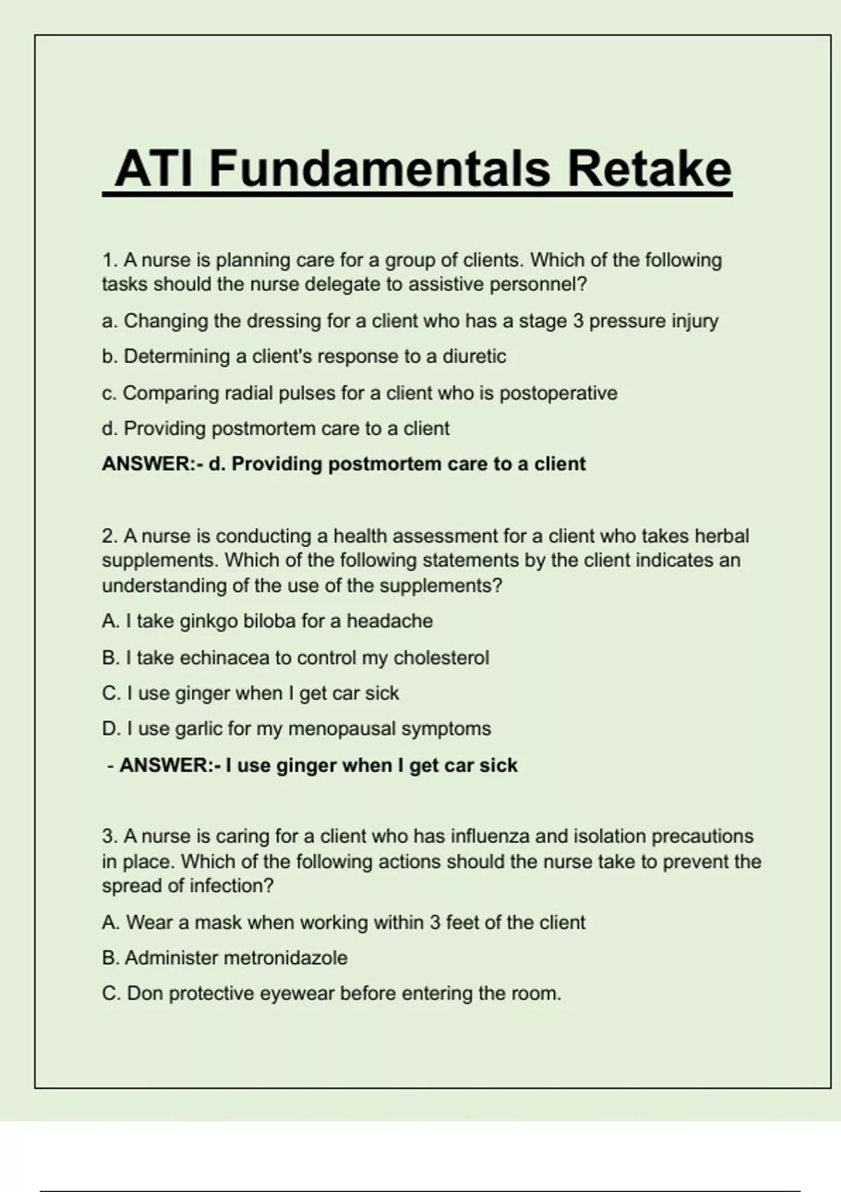 ATI FundamentalsATI Fundamentals Retake 1. A nurse is planning care for a group of clients. Which of the following tasks should the nurse delegate to assistive personnel? a. Changing the dressing for a client who has a stage 3 pressure injury b. Determining a client's response to a diuretic c. Comparing radial pulses for a client who is postoperative d. Providing postmortem care to a client ANSWER:- d. Providing postmortem care to a client 2. A nurse is conducting a health assessment for a client who takes herbal supplements. Which of the following statements by the client indicates an understanding of the use of the supplements? A. I take ginkgo biloba for a headache B. I take echinacea to control my cholesterol C. I use ginger when I get car sick D. I use garlic for my menopausal symptoms - ANSWER:- I use ginger when I get car sick 3. A nurse is caring for a client who has influenza and isolation precautions in place. Which of the following actions should the nurse take to prevent the spread of infection? A. Wear a mask when working within 3 feet of the client B. Administer metronidazole C. Don