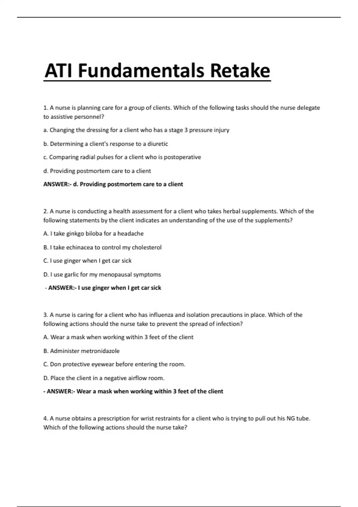 ATI Fundamentals Retake 1. A nurse is planning care for a group of clients. Which of the following tasks should the nurse delegate to assistive personnel? a. Changing the dressing for a client who has a stage 3 pressure injury b. Determining a client's response to a diuretic c. Comparing radial pulses for a client who is postoperative d. Providing postmortem care to a client ANSWER:- d. Providing postmortem care to a client 2. A nurse is conducting a health assessment for a client who takes herbal supplements. Which of the following statements by the client indicates an understanding of the use of the supplements? A. I take ginkgo biloba for a headache B. I take echinacea to control my cholesterol C. I use ginger when I get car sick D. I use garlic for my menopausal symptoms - ANSWER:- I use ginger when I get car sick 3. A nurse is caring for a client who has influenza and isolation precautions in place. Which of the following actions should the nurse take to prevent the spread of infection? A. Wear a mask when working within 3 feet of the client B. Administer metronidazole C. Don