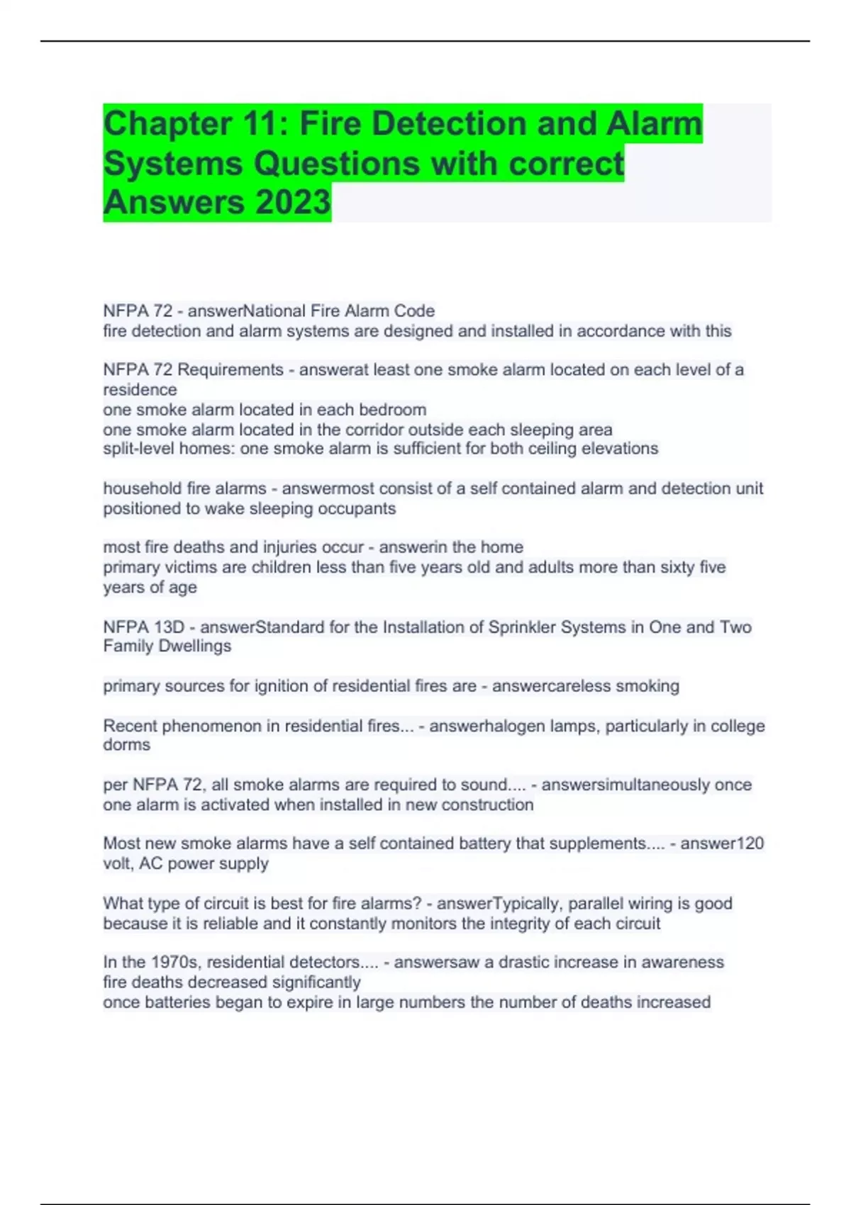 Chapter 11 Fire Detection and Alarm Systems Questions with correct Answers 2023 NFPA 72 National Fire Alarm Code fire detection and alarm systems are designed and installed in accordance with this NFPA 72 Requirements at least one smoke alarm located on each level of a residence one smoke alarm located in each bedroom one smoke alarm located in the corridor outside each sleeping area split-level homes: one smoke alarm is sufficient for both ceiling elevations household fire alarms most consist of a self contained alarm and detection unit positioned to wake sleeping occupants most fire deaths and injuries occur in the home primary victims are children less than five years old and adults more than sixty five years of age NFPA 13D Standard for the Installation of Sprinkler Systems in One and Two Family Dwellings primary sources for ignition of residential fires are careless smoking Recent phenomenon in residential fires... halogen lamps, particularly in college dorms per NFPA 72, all smoke alarms are required to sound.... simultaneously once one alarm is activated when installed in new construction Most new smoke alarms have a self contained battery that supplements.... 120 volt, AC power supply What type of circuit is best for fire alarms? Typically, parallel wiring is good because it is reliable and it constantly monitors the integrity of each circuit In the 1970s, residential detectors.... saw a drastic increase in awareness fire deaths decreased significantly once batteries began to expire in large numbers the number of deaths increased house fires typically involve a period of __________, which makes smoke detectors so effective smoldering decibel unit of sound of a given intensity at a given distance ex- 84 dB at 100 ft. Most people will be awakened with a signal of ______ dB over the ambient noise level 15 dB