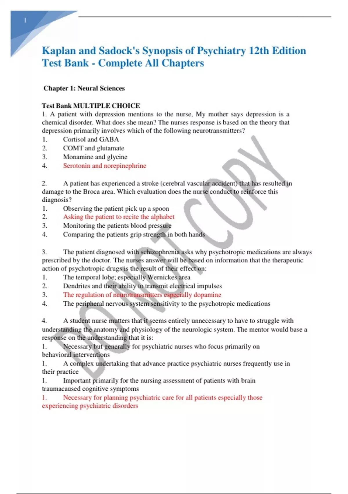 Kaplan and Sadock's Synopsis of Psychiatry 12th Edition Test Bank - Complete All Chapters