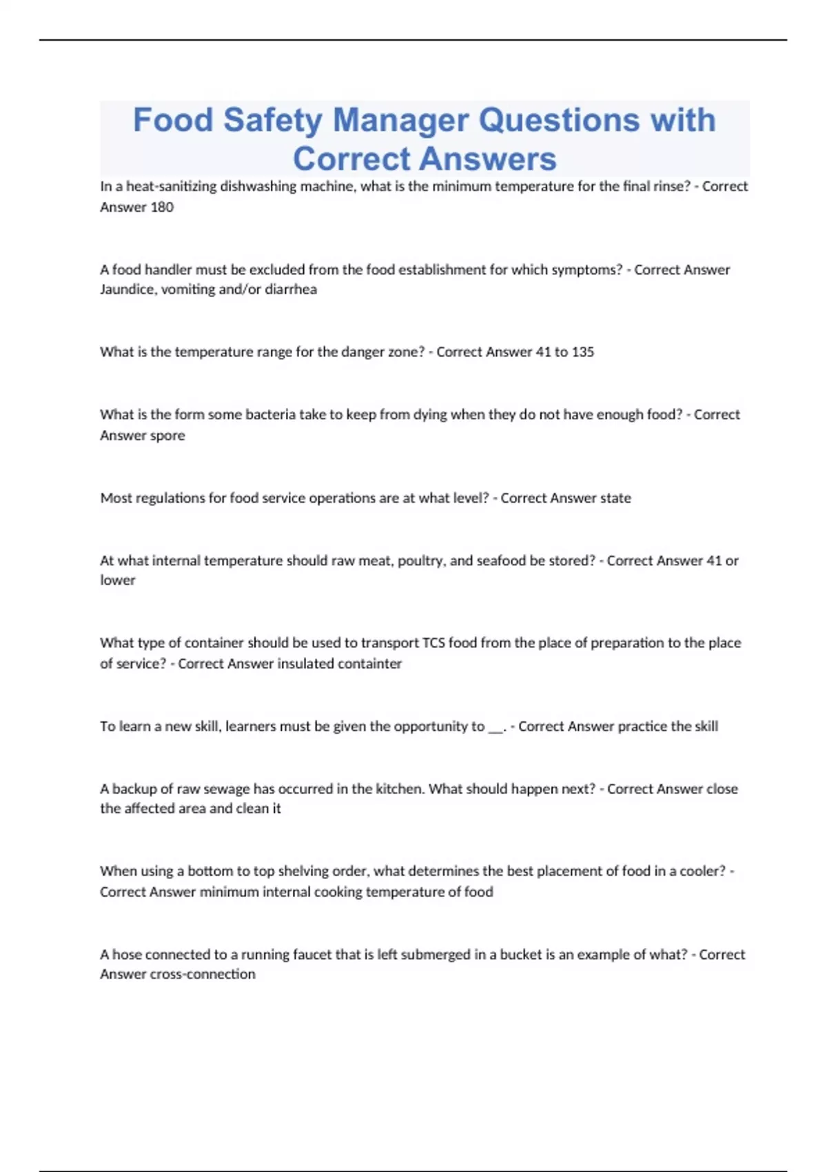 Food Safety Manager Questions with Correct Answers In a heat-sanitizing dishwashing machine, what is the minimum temperature for the final rinse? - Correct Answer 180 A food handler must be excluded from the food establishment for which symptoms? - Correct Answer Jaundice, vomiting and/or diarrhea What is the temperature range for the danger zone? - Correct Answer 41 to 135 What is the form some bacteria take to keep from dying when they do not have enough food? - Correct Answer spore Most regulations for food service operations are at what level? - Correct Answer state At what internal temperature should raw meat, poultry, and seafood be stored? - Correct Answer 41 or lower What type of container should be used to transport TCS food from the place of preparation to the place of service? - Correct Answer insulated containter To learn a new skill, learners must be given the opportunity to __. - Correct Answer practice the skill A backup of raw sewage has occurred in the kitchen. What should happen next? - Correct Answer close the affected area and clean it When using a bottom to top shelving order, what determines the best placement of food in a cooler? - Correct Answer minimum internal cooking temperature of food A hose connected to a running faucet that is left submerged in a bucket is an example of what? - Correct Answer cross-connection