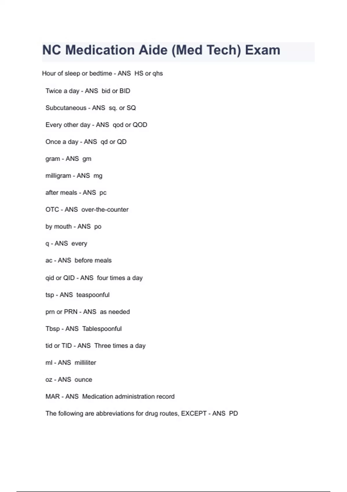 NC Medication Aide (Med Tech) Exam Hour of sleep or bedtime - ANS HS or qhs Twice a day - ANS bid or BID Subcutaneous - ANS sq. or SQ Every other day - ANS qod or QOD Once a day - ANS qd or QD gram - ANS gm milligram - ANS mg after meals - ANS pc OTC - ANS over-the-counter by mouth - ANS po q - ANS every ac - ANS before meals qid or QID - ANS four times a day tsp - ANS teaspoonful prn or PRN - ANS as needed Tbsp - ANS Tablespoonful tid or TID - ANS Three times a day ml - ANS milliliter oz - ANS ounce MAR - ANS Medication administration record