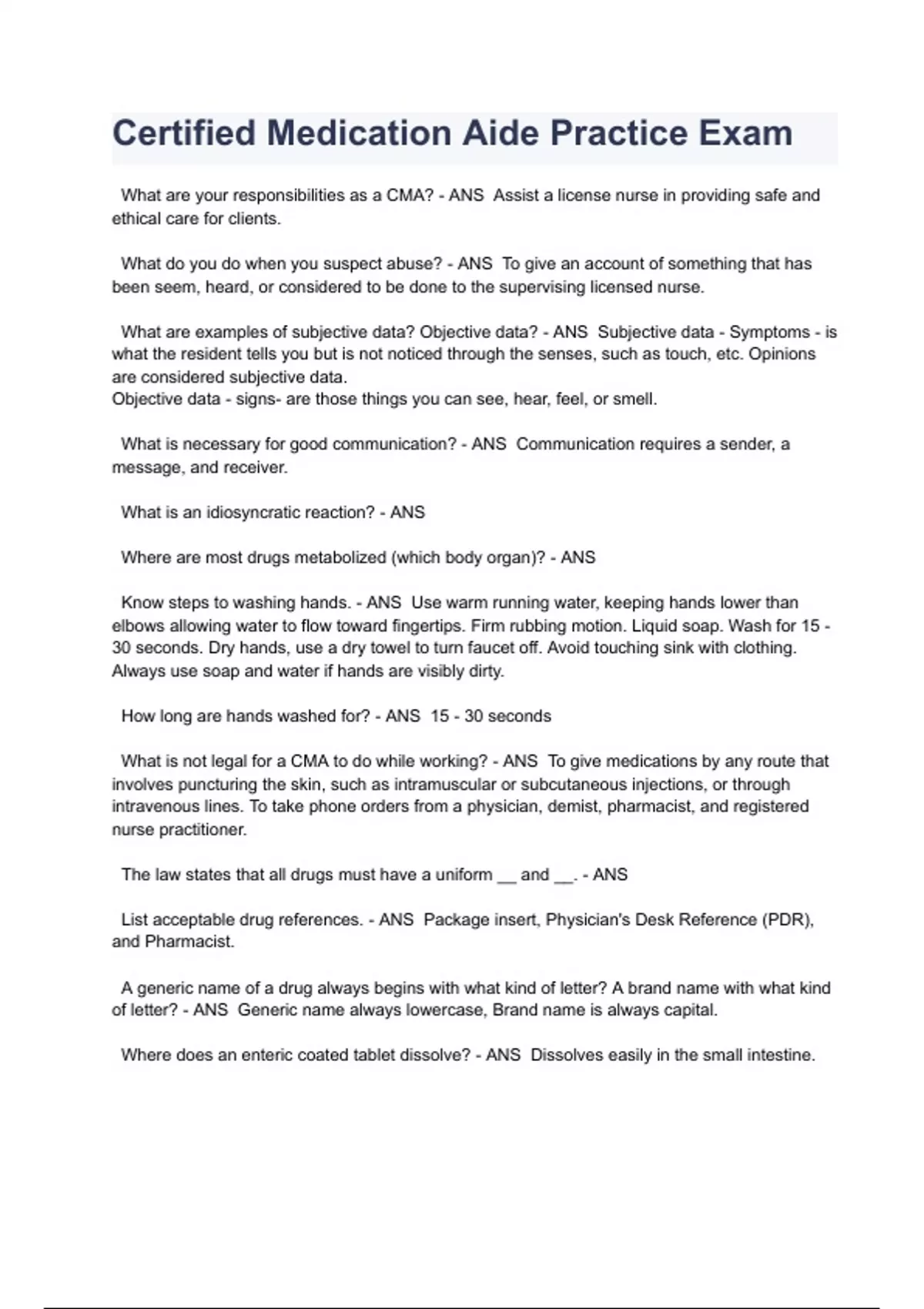 Certified Medication Aide Practice Exam What are your responsibilities as a CMA? - ANS Assist a license nurse in providing safe and ethical care for clients. What do you do when you suspect abuse? - ANS To give an account of something that has been seem, heard, or considered to be done to the supervising licensed nurse. What are examples of subjective data? Objective data? - ANS Subjective data - Symptoms - is what the resident tells you but is not noticed through the senses, such as touch, etc. Opinions are considered subjective data. Objective data - signs- are those things you can see, hear, feel, or smell. What is necessary for good communication? - ANS Communication requires a sender, a message, and receiver. What is an idiosyncratic reaction? - ANS Where are most drugs metabolized (which body organ)? - ANS Know steps to washing hands. - ANS Use warm running water, keeping hands lower than elbows allowing water to flow toward fingertips. Firm rubbing motion. Liquid soap. Wash for 15 - 30 seconds. Dry hands, use a dry towel to turn faucet off. Avoid touching sink with clothing. Always use soap and water if hands are visibly dirty. How long are hands washed for? - ANS 15 - 30 seconds What is not legal for a CMA to do while working? - ANS To give medications by any route that involves puncturing the skin, such as intramuscular or subcutaneous injections, or through intravenous lines. To take phone orders from a physician, demist, pharmacist, and registered nurse practitioner. The law states that all drugs must have a uniform __ and __. - ANS List acceptable drug references. - ANS Package insert, Physician's Desk Reference (PDR), and Pharmacist. A generic name of a drug always begins with what kind of letter? A brand name with what kind of letter? - ANS Generic name always lowercase, Brand name is always capital. Where does an enteric coated tablet dissolve? - ANS Dissolves easily in the small intestine. How do you give a sublingual tablet? When in relation to other medications such as oral medications? - ANS You give the sublingual tablet last. How should the medication cart be stored? - ANS The medication cart should be locked when your not by it, and stored in the med room. List 5 factors that affect drug and medication action (there are more than)? - ANS What are the primary routes of excretion? - ANS Through the urine or feces, or lungs, sweat, hair, or milk.