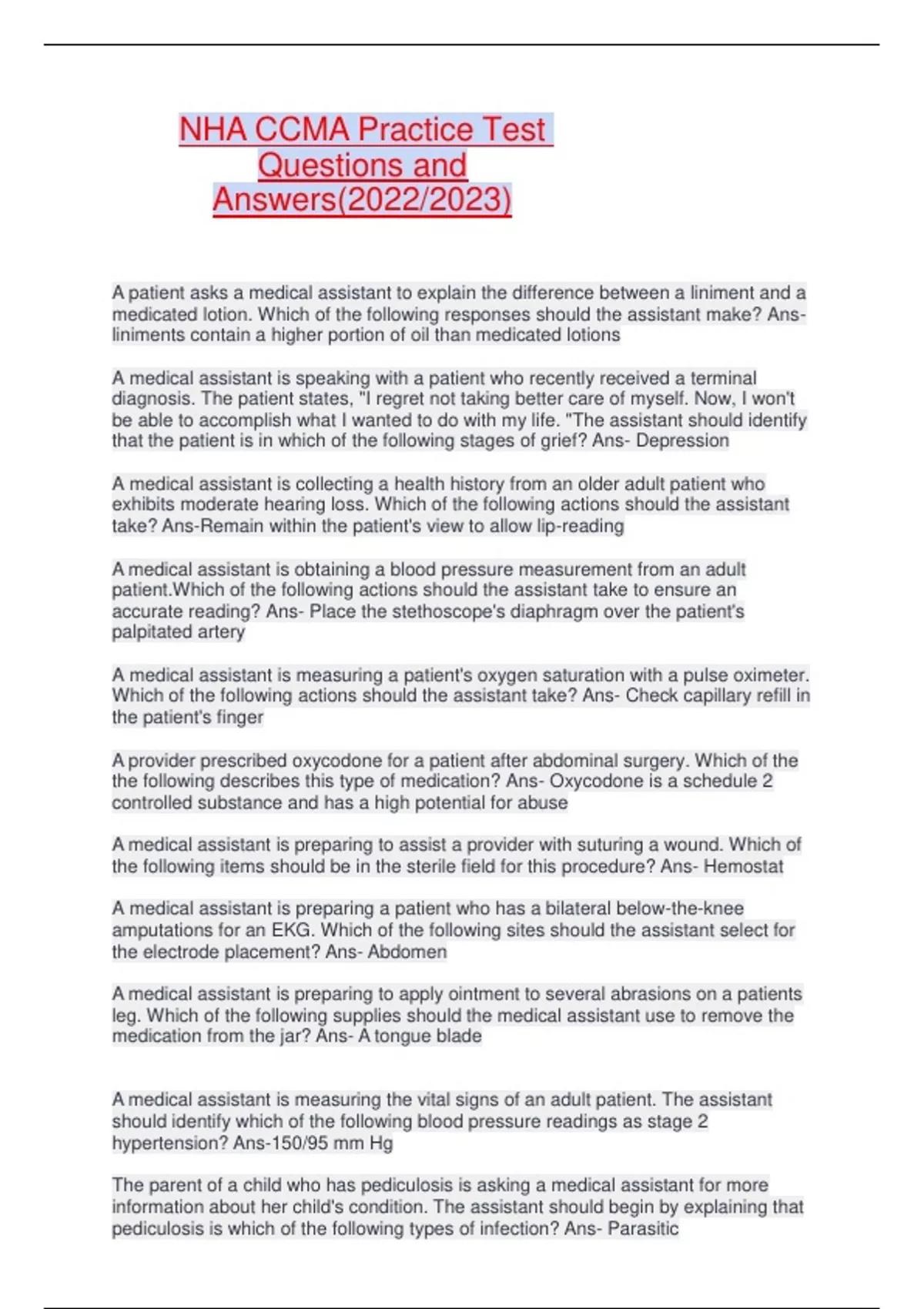 NHA CCMA Practice Test Questions and Answers(2022/2023) A patient asks a medical assistant to explain the difference between a liniment and a medicated lotion. Which of the following responses should the assistant make? Ansliniments contain a higher portion of oil than medicated lotions A medical assistant is speaking with a patient who recently received a terminal diagnosis. The patient states, "I regret not taking better care of myself. Now, I won't be able to accomplish what I wanted to do with my life. "The assistant should identify that the patient is in which of the following stages of grief? Ans- Depression A medical assistant is collecting a health history from an older adult patient who exhibits moderate hearing loss. Which of the following actions should the assistant take? Ans-Remain within the patient's view to allow lip-reading A medical assistant is obtaining a blood pressure measurement from an adult patient.Which of the following actions should the assistant take to ensure an accurate reading? Ans- Place the stethoscope's diaphragm over the patient's palpitated artery A medical assistant is measuring a patient's oxygen saturation with a pulse oximeter. Which of the following actions should the assistant take? Ans- Check capillary refill in the patient's finger A provider prescribed oxycodone for a patient after abdominal surgery. Which of the the following describes this type of medication? Ans- Oxycodone is a schedule 2 controlled substance and has a high potential for abuse A medical assistant is preparing to assist a provider with suturing a wound. Which of the following items should be in the sterile field for this procedure? Ans- Hemostat A medical assistant is preparing a patient who has a bilateral below-the-knee amputations for an EKG. Which of the following sites should the assistant select for the electrode placement? Ans- Abdomen A medical assistant is preparing to apply ointment to several abrasions on a patients leg. Which of the following supplies should the medical assistant use to remove the medication from the jar? Ans- A tongue blade A medical assistant is measuring the vital signs of an adult patient. The assistant should identify which of the following blood pressure readings as stage 2 hypertension? Ans-150/95 mm Hg The parent of a child who has pediculosis is asking a medical assistant for more information about her child's condition. The assistant should begin by explaining that pediculosis is which of the following types of infection? Ans- Parasitic A medical assistant is explaining to a female patient how to collect a clean catch urine specimen. Which of the following instructions should the assistant include? Ans- With the labia spread, urinate a small amount into the toilet before collecting the sample A medical assistant is assisting with the physical examination of a patient who has scabies. Besides gloves, which of the following pieces of personal protective equipment should the assistant take? Ans- Gown A medical assistant is explaining a venipuncture procedure to a patient. Which of the following statements should the assistant make? Ans- "I'll be collecting a blood sample from you today. There will be a small stick in your arm” A medical assistant is measuring the circumference of an infants head. Which of the following actions should the assistant take? Ans- Place the zero mark of the measuring tape against the infants forehead. A medical assistant is reinforcing teaching with a patient about the self-administration of insulin injections. Which of the following patient statements indicates an understanding of the teaching? Ans- "I will roll the bottle between my hands before drawing the medication" A medical assistant discovers a garbage can fire has started in the break room of the medical office. According to the RACE acronym for emergency response, which of the following actions should the assistant take first? Ans- Evacuate staff and patients from the immediate area A medical assistant should use which of the following solutions to prepare a patients skin prior to drawing blood cultures? Ans- Chlorhexidine When assisting a provider with a punch of biopsy of a mole, which of the following tasks should a medical assistant expect to perform? Ans- Receive and prepare tissue specimens for processing A medical assistant is preparing to administer a liquid, oral medication to a parent. Which of the following methods should the assistant use to ensure the correct dose is delivered? Ans- Pour the medication to the prescribed dose in the medicine cup on a flat surface A medical assistant is scheduling diagnostic tests for a patients liver and pancreas. Which of the following systems is being assessed? Ans- digestive Which of the following actions should a medical assistant take to verify the quality of venipuncture supplies before beginning a blood draw? Ans- Inspect the integrity of theneedle's seal A medical assistant is testing a patient's visual acuity using a Snellen chart. Which of the following actions should the assistant take? Ans- Make sure the patient does not lean forward during the test A medical assistant is writing a piece of professional correspondence to a consulting provider. In which of the following ways should the assistant record the date on the letter? Ans- January 1, 2020 A medical assistant is preparing a patient who has intermittent peripheral cyanosis for an examination by the provider. The assistant should understand that healthy perfusion of the hands and feet depends on the adequate interaction between which of the following two body systems? Ans- Circulatory and respiratory Which of the following cell structures is the source of energy for a cell? AnsMitochondria An adolescent is covered by two insurance policies under her divorced parents who have birthdays in May and August and have joint custody. Which policy is the primary policy for the adolescent? Ans- The policy of the parent who has the earliest birth mo