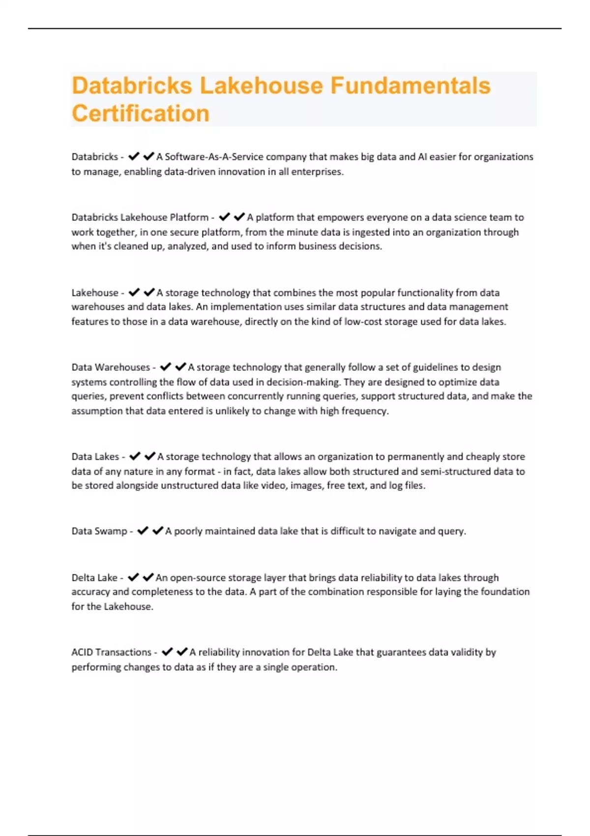 Databricks - A Software-As-A-Service company that makes big data and AI easier for organizations to manage, enabling data-driven innovation in all enterprises. Databricks Lakehouse Platform - A platform that empowers everyone on a data science team to work together, in one secure platform, from the minute data is ingested into an organization through when it's cleaned up, analyzed, and used to inform business decisions. Lakehouse - A storage technology that combines the most popular functionality from data warehouses and data lakes. An implementation uses similar data structures and data management features to those in a data warehouse, directly on the kind of low-cost storage used for data lakes. Data Warehouses - A storage technology that generally follow a set of guidelines to design systems controlling the flow of data used in decision-making. They are designed to optimize data queries, prevent conflicts between concurrently running queries, support structured data, and make the assumption that data entered is unlikely to change with high frequency. Data Lakes - A storage technology that allows an organization to permanently and cheaply store data of any nature in any format - in fact, data lakes allow both structured and semi-structured data to be stored alongside unstructured data like video, images, free text, and log files. Data Swamp - A poorly maintained data lake that is difficult to navigate and query. Delta Lake - An open-source storage layer that brings data reliability to data lakes through accuracy and completeness to the data. A part of the combination responsible for laying the foundation for the Lakehouse. ACID Transactions - A reliability innovation for Delta Lake that guarantees data validity by performing changes to data as if they are a single operation.Indexing - A performance innovation for Delta Lake that orders an unordered table to maximize the efficiency of queries. Table Access Control Lists (ACLs) - A governance innovation for Delta Lake that ensures that only users who should have access to data can access it.