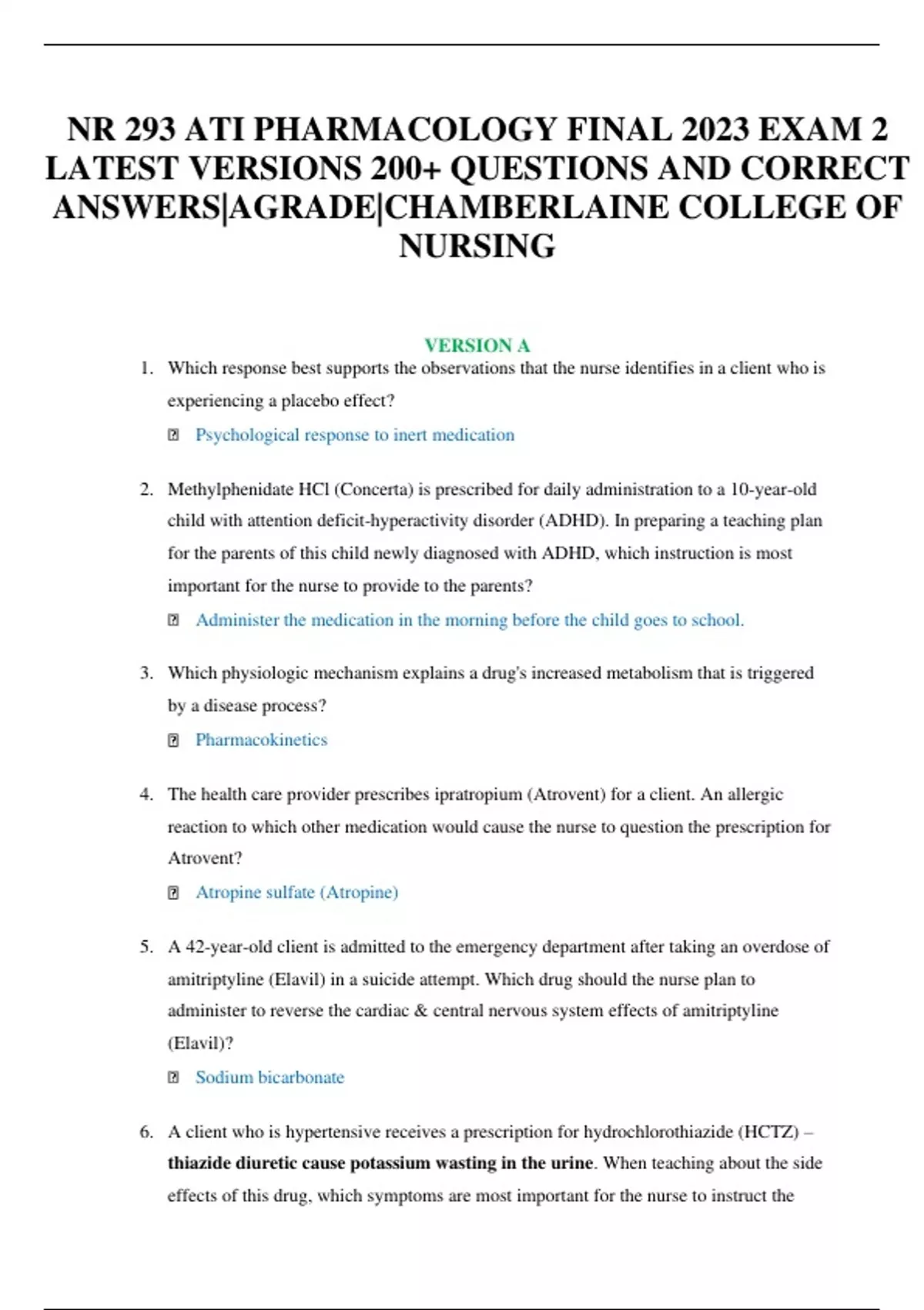 NR 293 ATI PHARMACOLOGY FINAL 2023 EXAM 2 LATEST VERSIONS 200+ QUESTIONS AND CORRECT ANSWERS|AGRADE|CHAMBERLAINE COLLEGE OF NURSING VERSION A 1. Which response best supports the observations that the nurse identifies in a client who is experiencing a placebo effect? Psychological response to inert medication 2. Methylphenidate HCl (Concerta) is prescribed for daily administration to a 10-year-old child with attention deficit-hyperactivity disorder (ADHD). In preparing a teaching plan for the parents of this child newly diagnosed with ADHD, which instruction is most important for the nurse to provide to the parents? Administer the medication in the morning before the child goes to school. 3. Which physiologic mechanism explains a drug's increased metabolism that is triggered by a disease process? Pharmacokinetics 4. The health care provider prescribes ipratropium (Atrovent) for a client. An allergic reaction to which other medication would cause the nurse to question the prescription for Atrovent? Atropine sulfate (Atropine) 5. A 42-year-old client is admitted to the emergency department after taking an overdose of amitriptyline (Elavil) in a suicide attempt. Which drug should the nurse plan to administer to reverse the cardiac & central nervous system effects of amitriptyline (Elavil)? Sodium bicarbonate 6. A client who is hypertensive receives a prescription for hydrochlorothiazide (HCTZ) – thiazide diuretic cause potassium wasting in the urine. When teaching about the side effects of this drug, which symptoms are most important for the nurse to instruct the client to report? Fatigue & muscle weakness 7. The nurse is preparing to apply a surface anesthetic agent for a client. Which action should the nurse implement to reduce the risk of systemic absorption? Avoid abraded skin areas when applying the anesthetic. – apply to the smallest surface of intact skin 8. The health care provider prescribes cisplatin (Platinol) to be administered in 5% dextrose & 0.45% normal saline with mannitol (Osmitrol) added. Which assessment parameters would be most helpful to the nurse in evaluating the effectiveness of the Osmitrol therapy? Urine output 9. A 19-year-old male client who has sustained a severe head injury is intubated & placed on assisted mechanical ventilation. To facilitate optimal ventilation & prevent the client from "fighting" the ventilator, the health care provider administers pancuronium bromide (Pavulon) IV, with adjunctive opioid analgesia. What medication should the nurse maintain at the client's bedside? Neostigmine bromide (Prostigmin) 10. The nurse is reviewing a client's laboratory results before a proc