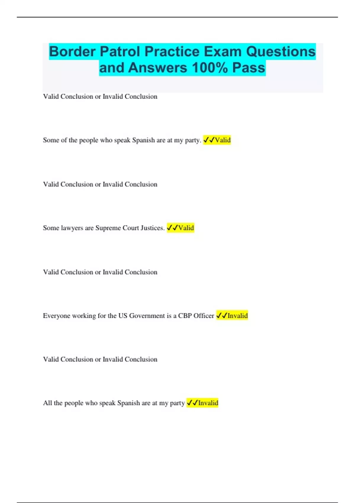 Border Patrol Practice Exam Questions and Answers 100% Pass Valid Conclusion or Invalid Conclusion Some of the people who speak Spanish are at my party. Valid Valid Conclusion or Invalid Conclusion Some lawyers are Supreme Court Justices. Valid Valid Conclusion or Invalid Conclusion Everyone working for the US Government is a CBP Officer Invalid Valid Conclusion or Invalid Conclusion All the people who speak Spanish are at my party Invalid Valid Conclusion or Invalid Conclusion All lawyers are Supreme Court Justices Invalid Valid Conclusion or Invalid Conclusion Some employees of the US Government are CBP Officers Valid Valid Conclusion or Invalid Conclusion If a person is not an employee of the US Government, the person is not a CBP Officer Valid Valid Conclusion or Invalid Conclusion If a criminal is released, the criminal has recieved a pardon Invalid Valid Conclusion or Invalid Conclusion If a person is not guilty of a felony, that person has not been convicted of a murder Valid Valid Conclusion or Invalid Conclusion If a person lives in Europe, the person lives in Germany Invalid Valid Conclusion or Invalid Conclusion If a car runs, the car has gas Valid Valid Conclusion or Invalid Conclusion If a person is an employee of the US Government, the person is a CBP Officer Invalid Valid Conclusion or Invalid Conclusion If a criminal is not released, the criminal has not received a pardon Valid Valid Conclusion or Invalid Conclusion If a person is guilty of a felony, that person has been convicted of murder Invalid Valid Conclusion or Invalid Conclusion If a person does not live in Europe, the person does not live in Germany Valid Valid Conclusion or Invalid Conclusion If a car does not run, the car has no gas Invalid Positive Words or Negative Words All Positive Positive Words or Negative Words Seldom Negative Positive Words or Negative Words Some Positive Positive Words or Negative Words Never Negative Positive Words or Negative Words Most Positive Positive Words or Negative Words Always
