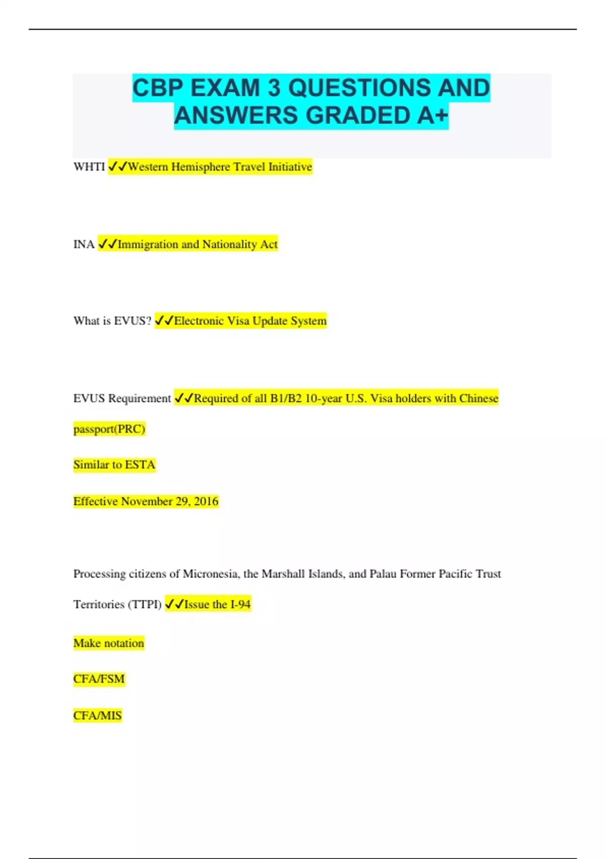 CBP EXAM 3 QUESTIONS AND ANSWERS GRADED A+ WHTI Western Hemisphere Travel Initiative INA Immigration and Nationality Act What is EVUS? Electronic Visa Update System EVUS Requirement Required of all B1/B2 10-year U.S. Visa holders with Chinese passport(PRC) Similar to ESTA Effective November 29, 2016 Processing citizens of Micronesia, the Marshall Islands, and Palau Former Pacific Trust Territories (TTPI) Issue the I-94 Make notation CFA/FSM CFA/MIS CFA/PAL on the I-94 in the admission stamp area. D/S Processing B-1 & B-2 Visitors Verify Identity Verify PP or WHTI compliant document Proper NIV Establish the purpose of the trip issue I-94 Determine the length of trip not to exceed 1 year Processing C Visas Verify Identity Verify PP or WHTI compliant document Proper NIV Establish the purpose of the trip issue I-94 Do not take biometrics for C-3 Classifications Processing F-1 and M-1 Students Aliens have: Verify identity Valid PP or WHTI compliant document Proper NIV SEVIS Form I-20 Financial support as indicated on I-20 I-94 D/S for F-1 and D/C + 30 days for M-1 Processing J-1 Exchange Visitors Verify identity Valid PP or WHTI compliant document Proper NIV DS-2019 I-94 D/S The program sponsor must sign in blue ink Processing Fiance(e)s of U.S. Citizens (K-1) Verify identity Valid PP Proper NIV Verify the is in possession of a valid, approved I-129F petition E Class Visas: E-1 Treaty Traders E-2 Treaty investors E-3 Australians in specialty occupations Note: All E's including Canadians, require a visa Processing E Class Visas Verify identity Valid PP Proper NIV Establish the purpose of the trip to ensure consistency with the visas classification I-94 2 years upon initial admission Class A Visas A-1 Ambassadors and Head of State A-2 Other government Officials A-3 Servants of A-1 and A-2 visitors Processing Class A Visitors Verify Identity Valid PP Canadians diplomats are not required to have a class A Visa Establish admissibility to the U.S. under existing law Immediately notify the supervisor I-94 without bio-metrics D/S Class G Visas Class G Visas are issued to aliens on official business as a foreign government representative for an international organization. G-1 through G-5 I-68 Canadian Border Boat Landing permit may enter for 72 hours I-90 Application to Replace Permanent Resident Card I-94 Arrival/Departure Record I-94W Required for Visa Waiver(VWP) travelers who are not ESTA approved. Land Border and I-94s Non-immigrants issued an I-94 must pay a $6 fee I-94s are generally for multiple entry I-94 Exceptions Canadian or Bermudian visitor for business or pleasure or in transit Mexican visitor in transit through the U.S. holding a Mexican diplomatic or official passport Mexican visitor within 25 miles of the Mexican land border
