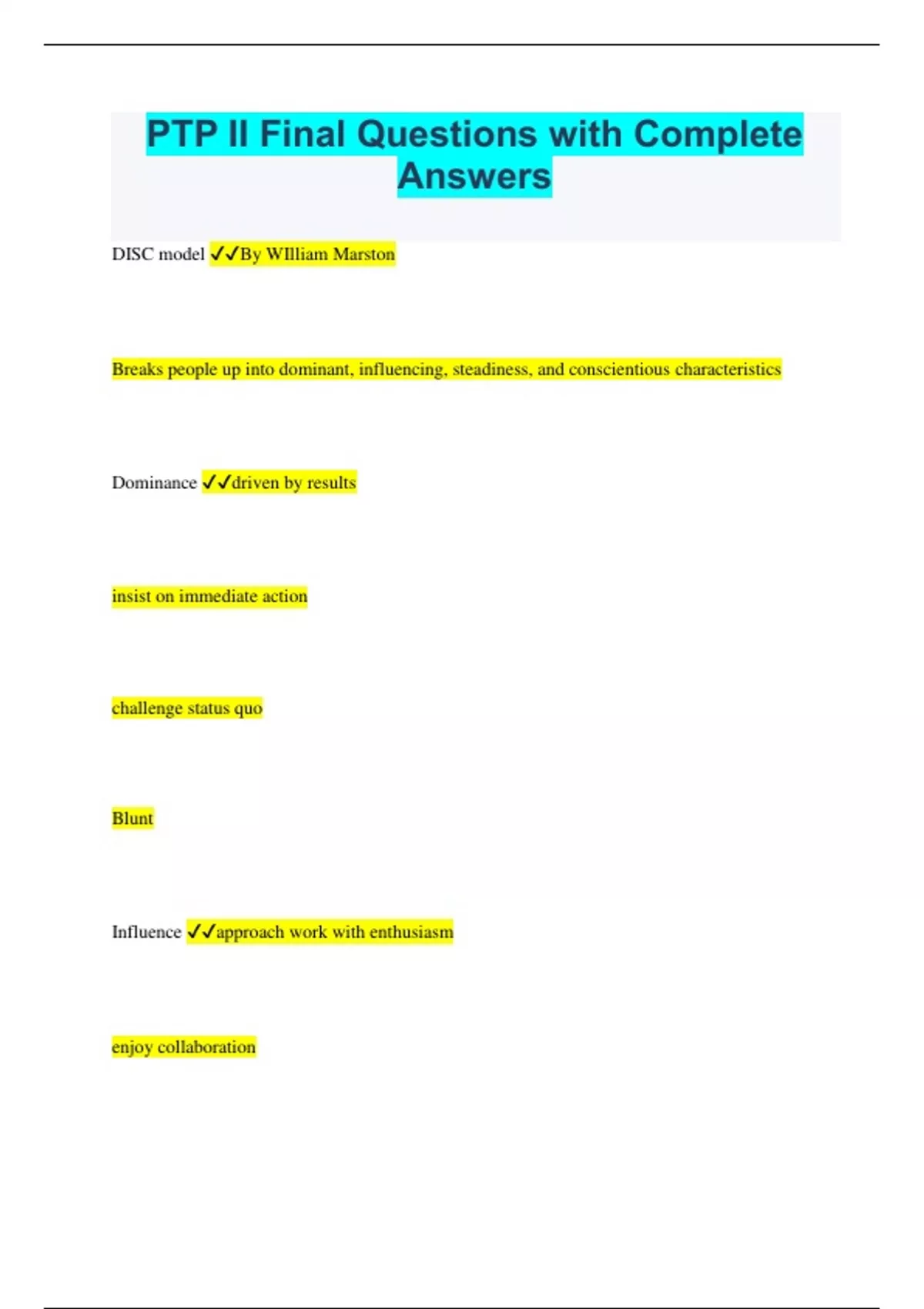PTP II Final Questions with Complete Answers DISC model By WIlliam Marston Breaks people up into dominant, influencing, steadiness, and conscientious characteristics Dominance driven by results insist on immediate action challenge status quo Blunt Influence approach work with enthusiasm enjoy collaboration take quick action fast paced Steadiness maintain stability enjoy supporting people lijke collaboration patient/easy going Conscientiousness focus on accuracy using logic seek stability cautious RESPECT model Rapport Empathy Support Partnership Explanations Cultural Competence Trust How can a PT build rapport with a pt? engage pt on social level seek out pt POV Suspend judgements avoid assumptions and recognize when you have What are the 4 characteristics that lead to SUPPORT of a patient? Ask about and try to understand barriers to care and compliance Help the patient overcome barriers Involve family members if appropriate Reassure the patient you are and will be available to help What are 5 things that may lead to patient trust issues? Patients come worried and often in pain Past experiences Feel vulnerable and in need of help and understanding Want to