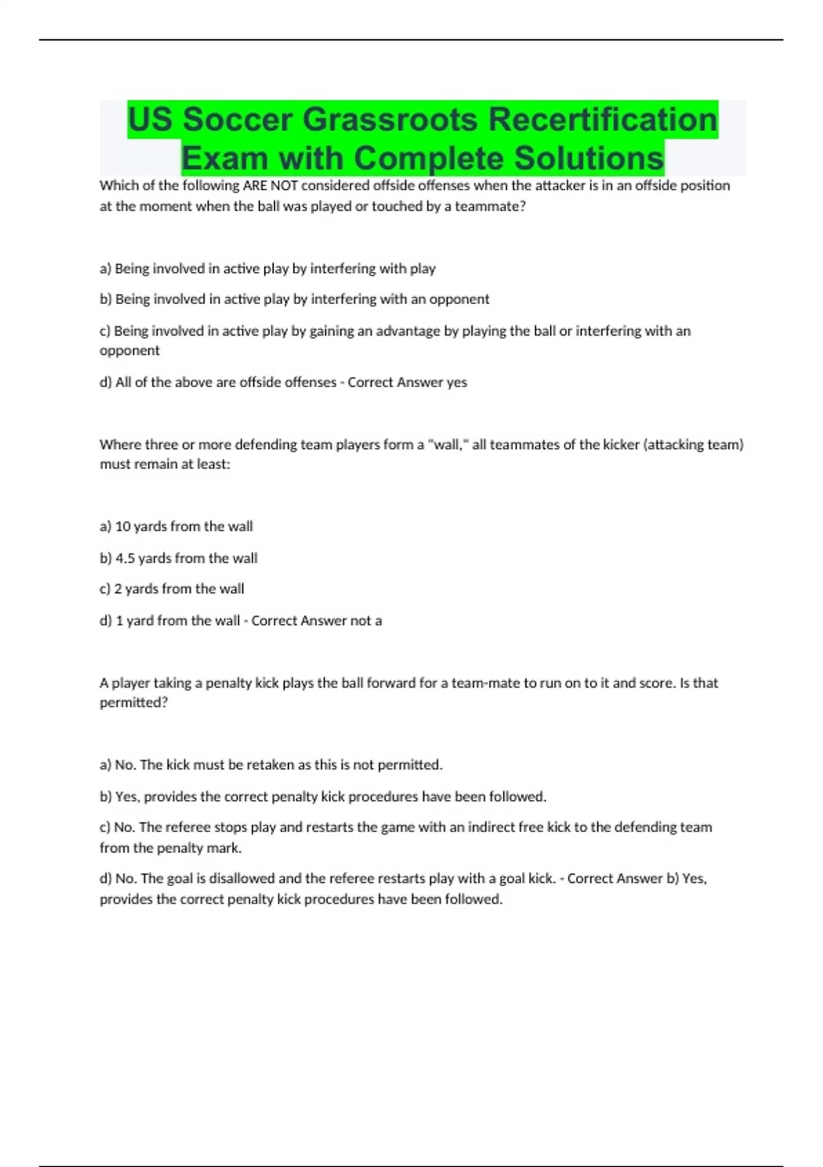 US Soccer Grassroots Recertification Exam with Complete Solutions Which of the following ARE NOT considered offside offenses when the attacker is in an offside position at the moment when the ball was played or touched by a teammate? a) Being involved in active play by interfering with play b) Being involved in active play by interfering with an opponent c) Being involved in active play by gaining an advantage by playing the ball or interfering with an opponent d) All of the above are offside offenses - Correct Answer yes Where three or more defending team players form a "wall," all teammates of the kicker (attacking team) must remain at least: a) 10 yards from the wall b) 4.5 yards from the wall c) 2 yards from the wall d) 1 yard from the wall - Correct Answer not a A player taking a penalty kick plays the ball forward for a team-mate to run on to it and score. Is that permitted? a) No. The kick must be retaken as this is not permitted. b) Yes, provides the correct penalty kick procedures have been followed. c) No. The referee stops play and restarts the game with an indirect free kick to the defending team from the penalty mark. d) No. The goal is disallowed and the referee restarts play with a goal kick. - Correct Answer b) Yes, provides the correct penalty kick procedures have been followed.
