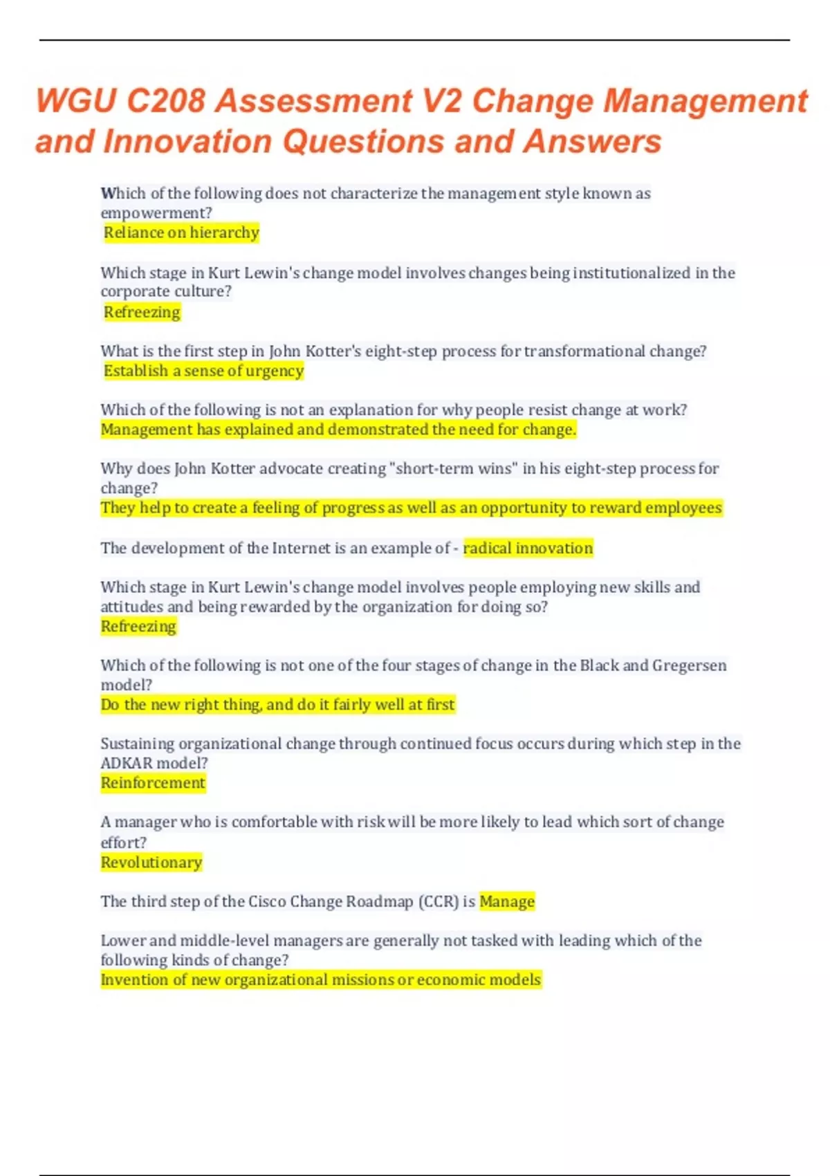WGU C208 Assessment V2 Change Management and Innovation Questions and Answers (2023 – 2024)