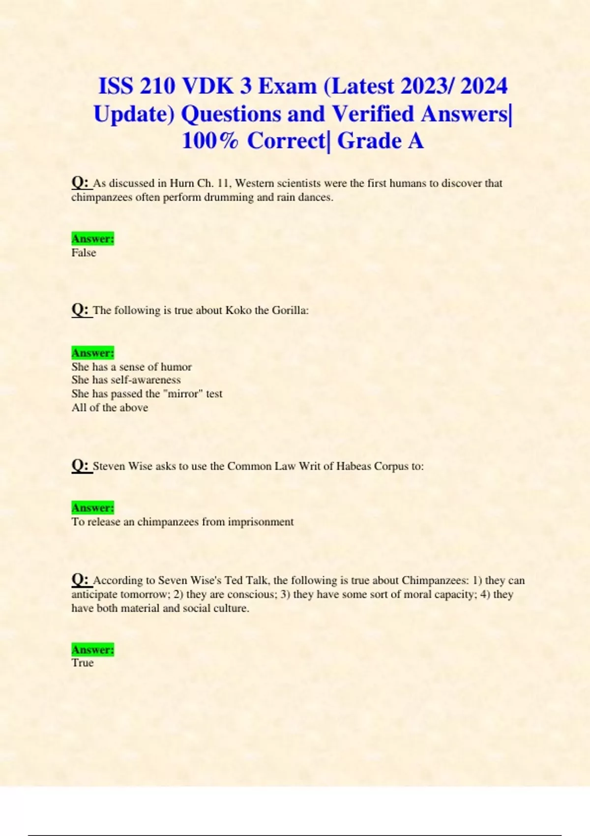 ISS 210 VDK 3 Exam (Latest 2023/ 2024 Update) Questions and Verified Answers| 100% Correct| Grade A Q: As discussed in Hurn Ch. 11, Western scientists were the first humans to discover that chimpanzees often perform drumming and rain dances. Answer: False Q: The following is true about Koko the Gorilla: Answer: She has a sense of humor She has self-awareness She has passed the "mirror" test All of the above Q: Steven Wise asks to use the Common Law Writ of Habeas Corpus to: Answer: To release an chimpanzees from imprisonment Q: According to Seven Wise's Ted Talk, the following is true about Chimpanzees: 1) they can anticipate tomorrow; 2) they are conscious; 3) they have some sort of moral capacity; 4) they have both material and social culture. Answer: True Q: As it currently stands in the United States legal system, regardless of cognitive function and ability, language capacity, self-awareness, and so on - all humans are considered persons and all non-human animals are considered things/property. Answer: true Q: Steven Wise would agree with the following statement (this is a quote in the documentary): Answer: Chimps should have the sort of rights a human five year old has. Q: As discussed in Unlocking the Cage, the following is considered a legal person in the United States legal system: Answer: Corporations Q: Ron Kagan, director of Detroit Zoo, would likely agree with the following statement: Answer: Unless an animal can thrive in a given zoo environment, they should not be there Q: According to Garry Marvin, bullfighting is representational of: Answer: Man's taming of nature A reiteration of the human-animal binary An expression of what it means to be human All of the above