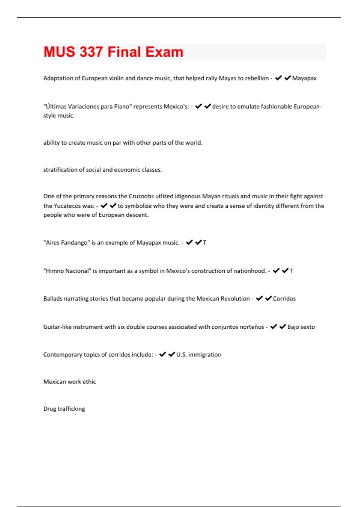 Adaptation of European violin and dance music, that helped rally Mayas to rebellion - Mayapax "Últimas Variaciones para Piano" represents Mexico's: - desire to emulate fashionable Europeanstyle music. ability to create music on par with other parts of the world. stratification of social and economic classes. One of the primary reasons the Cruzoobs utlized idigenous Mayan rituals and music in their fight against the Yucatecos was: - to symbolize who they were and create a sense of identity different from the people who were of European descent. "Aires Fandango" is an example of Mayapax music. - T "Himno Nacional" is important as a symbol in Mexico's construction of nationhood. - T Ballads narrating stories that became popular during the Mexican Revolution - Corridos Guitar-like instrument with six double courses associated with conjuntos norteños - Bajo sexto Contemporary topics of corridos include: - U.S. immigration Mexican work ethic Drug traffickingLos Tigres del Norte use doble sentido (double meaning) in their lyrics in order to "cover their tracks" when talking about sensitive information, a common tactic in songwriting throughout time and history. - T To be successful, corridos should tell a true story, almost like a musical newspaper. - T