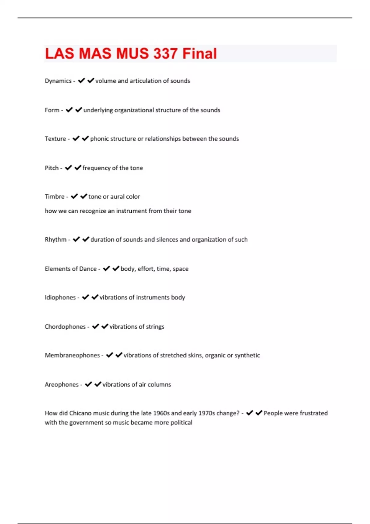 Dynamics - volume and articulation of sounds Form - underlying organizational structure of the sounds Texture - phonic structure or relationships between the sounds Pitch - frequency of the tone Timbre - tone or aural color how we can recognize an instrument from their tone Rhythm - duration of sounds and silences and organization of such Elements of Dance - body, effort, time, space Idiophones - vibrations of instruments body Chordophones - vibrations of strings Membraneophones - vibrations of stretched skins, organic or synthetic Areophones - vibrations of air columns How did Chicano music during the late 1960s and early 1970s change? - People were frustrated with the government so music became more politicalHow did the women in the film "Companeras" learn the mariachi traditions of music - They were self-taught or they studied classical music in school. But some of them did learn from their family