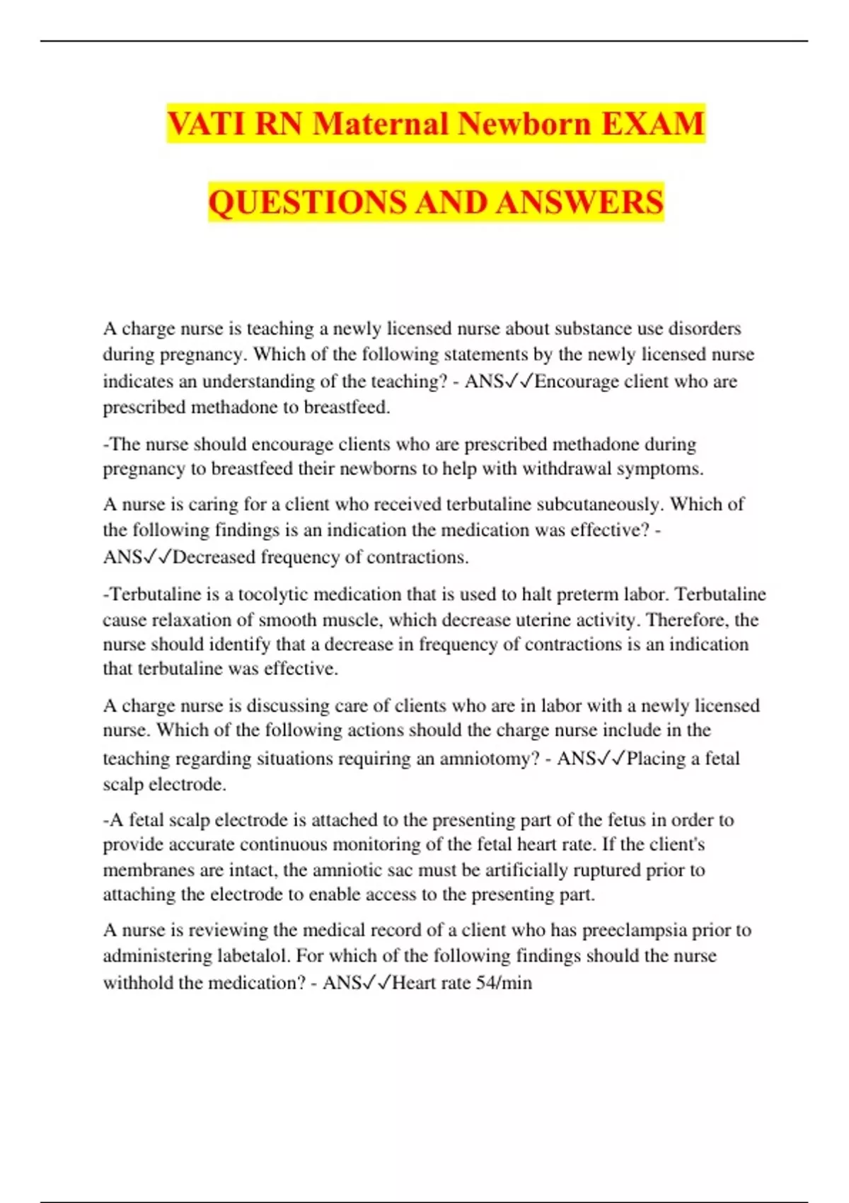 VATI RN Maternal Newborn EXAM QUESTIONS AND ANSWERS A charge nurse is teaching a newly licensed nurse about substance use disorders during pregnancy. Which of the following statements by the newly licensed nurse indicates an understanding of the teaching? - ANSEncourage client who are prescribed methadone to breastfeed. -The nurse should encourage clients who are prescribed methadone during pregnancy to breastfeed their newborns to help with withdrawal symptoms. A nurse is caring for a client who received terbutaline subcutaneously. Which of the following findings is an indication the medication was effective? - ANSDecreased frequency of contractions. -Terbutaline is a tocolytic medication that is used to halt preterm labor. Terbutaline cause relaxation of smooth muscle, which decrease uterine activity. Therefore, the nurse should identify that a decrease in frequency of contractions is an indication that terbutaline was effective. A charge nurse is discussing care of clients who are in labor with a newly licensed nurse. Which of the following actions should the charge nurse include in the teaching regarding situations requiring an amniotomy? - ANSPlacing a fetal scalp electrode. -A fetal scalp electrode is attached to the presenting part of the fetus in order to provide accurate continuous monitoring of the fetal heart rate. If the client's membranes are intact, the amniotic sac must be artificially ruptured prior to attaching the electrode to enable access to the presenting part. A nurse is reviewing the medical record of a client who has preeclampsia prior to administering labetalol. For which of the following findings should the nurse withhold the medication? - ANSHeart