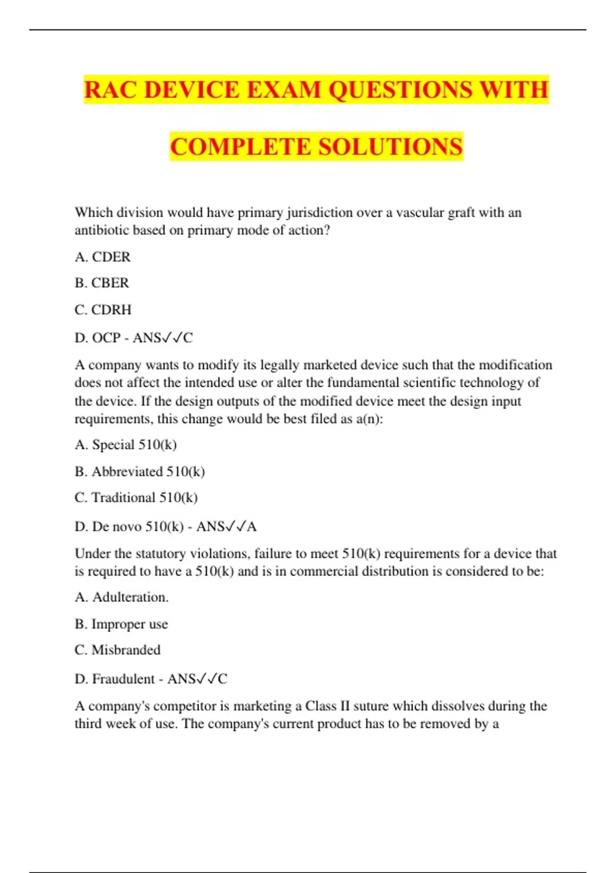 RAC DEVICE EXAM QUESTIONS WITH COMPLETE SOLUTIONS Which division would have primary jurisdiction over a vascular graft with an antibiotic based on primary mode of action? A. CDER B. CBER C. CDRH D. OCP - ANSC A company wants to modify its legally marketed device such that the modification does not affect the intended use or alter the fundamental scientific technology of the device. If the design outputs of the modified device meet the design input requirements, this change would be best filed as a(n): A. Special 510(k) B. Abbreviated 510(k) C. Traditional 510(k) D. De novo 510(k) - ANSA Under the statutory violations, failure to meet 510(k) requirements for a device that is required to have a 510(k) and is in commercial distribution is considered to be: A. Adulteration. B. Improper use C. Misbranded D. Fraudulent - ANSC A company's competitor is marketing a Class II suture which dissolves during the third week of use. The company's current product has to be removed by a physician. However, a change in weaving configuration gives this product the same dissolving time as the competitor's. When can the company's new suture be marketed? A. This requires a new 510(k) since significant change in product instructions might affect efficacy. B. After submission in a periodic report C. After reporting clinical studies in an annual report D. After submission of labeling change - ANSA Which of the following is exempt fr