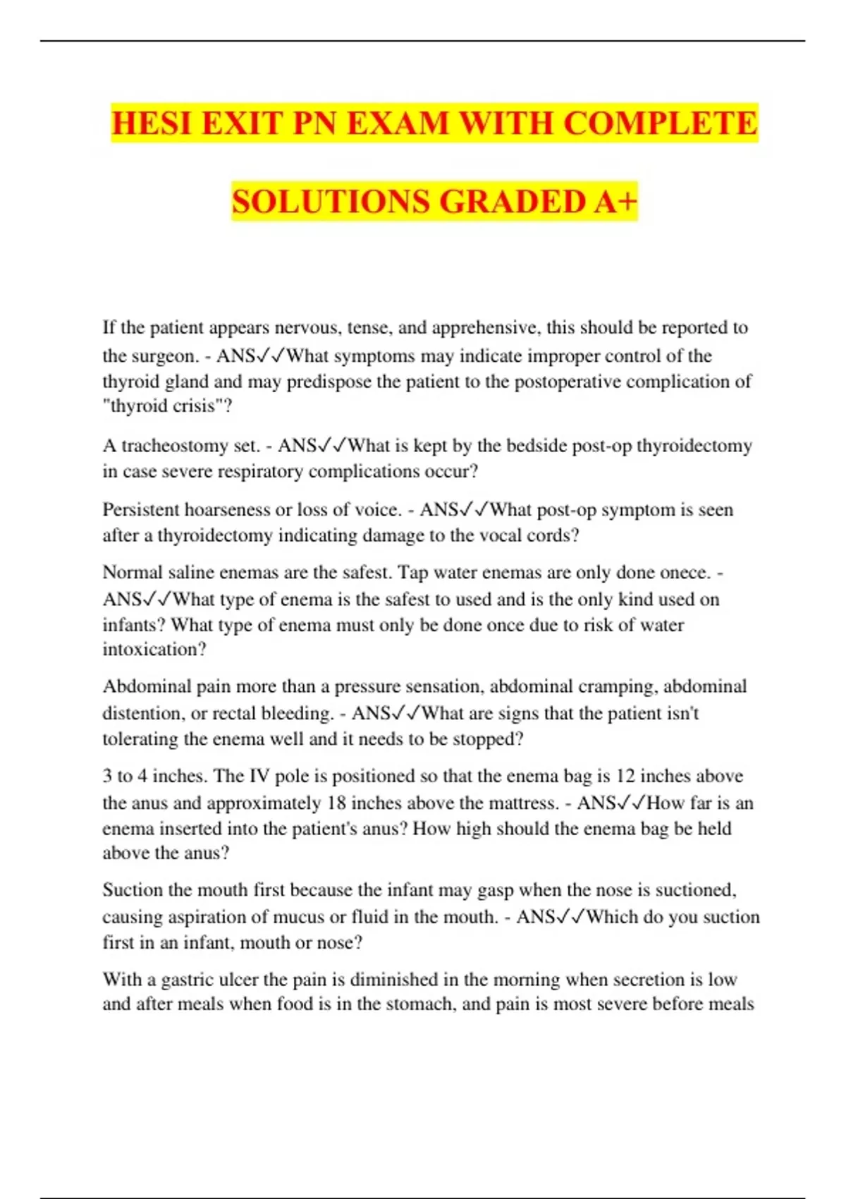 HESI EXIT PN EXAM WITH COMPLETE SOLUTIONS GRADED A+ If the patient appears nervous, tense, and apprehensive, this should be reported to the surgeon. - ANSWhat symptoms may indicate improper control of the thyroid gland and may predispose the patient to the postoperative complication of "thyroid crisis"? A tracheostomy set. - ANSWhat is kept by the bedside post-op thyroidectomy in case severe respiratory complications occur? Persistent hoarseness or loss of voice. - ANSWhat post-op symptom is seen after a thyroidectomy indicating damage to the vocal cords? Normal saline enemas are the safest. Tap wate
