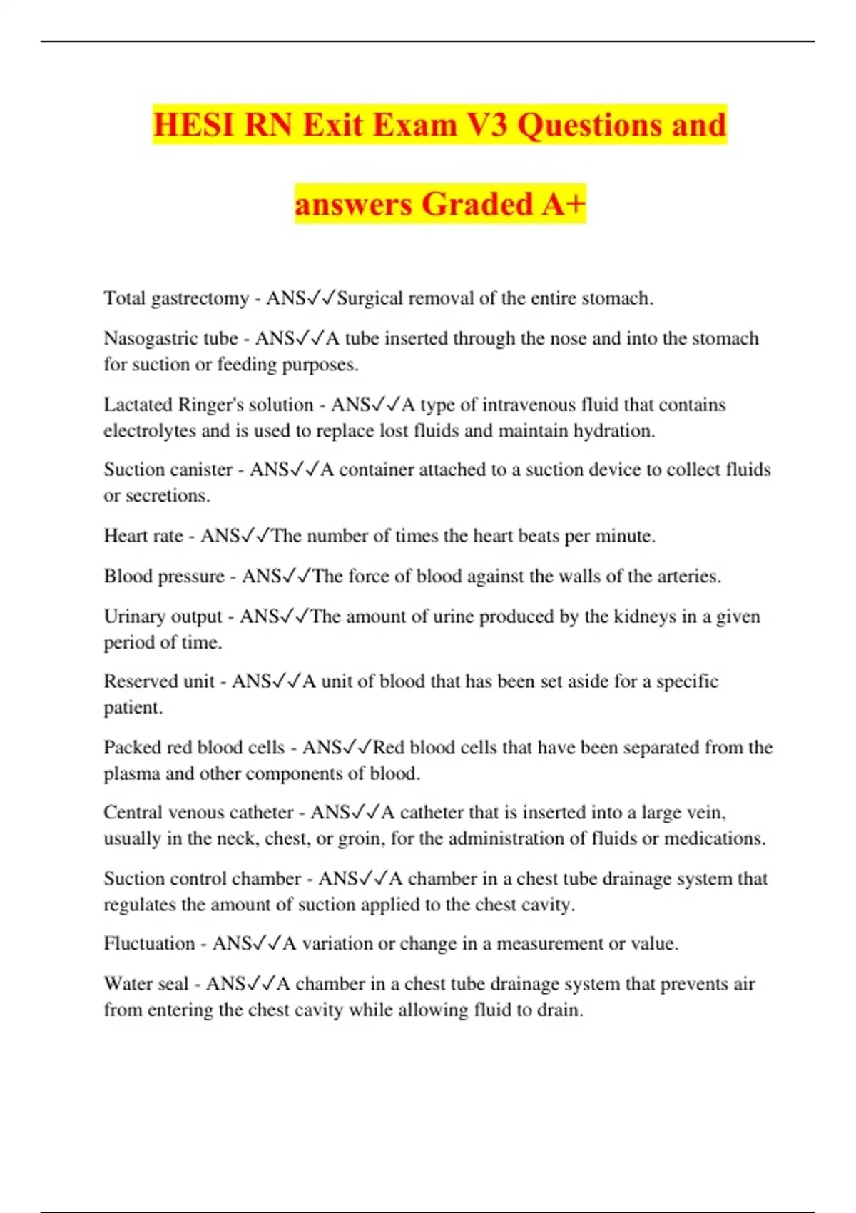 HESI RN Exit Exam V3 Questions and answers Graded A+ Total gastrectomy - ANSSurgical removal of the entire stomach. Nasogastric tube - ANSA tube inserted through the nose and into the stomach for suction or feeding purposes. Lactated Ringer's solution - ANSA type of intravenous fluid that contains electrolytes and is used to replace lost fluids and maintain hydration. Suction canister - ANSA container attached to a suction device to collect fluids or secretions. Heart rate - ANSThe number of times the heart beats per minute. Blood pressure - ANSThe force of blood against the walls of the arteries. Urinary output - ANSThe amount of urine produced by the kidneys in a given period of time. Reserved unit - ANSA unit of blood that has been set aside for a specific patient. Packed red blood cells - ANSRed blood cells that have been separated from the plasma and other components of blood. Central venous catheter - ANSA catheter that is inserted into a large vein, usually in the neck, chest, or groin, for the administration of fluids or medications. Suction control chamber - ANSA chamber in a chest tube drainage system that regulates the amount of suction applied to the chest cavity. Fluctuation - ANSA variation or change in a measurement or value. Water seal - ANSA chamber in a chest tube drainage system that prevents air from entering the chest cavity while allowing fluid to drain